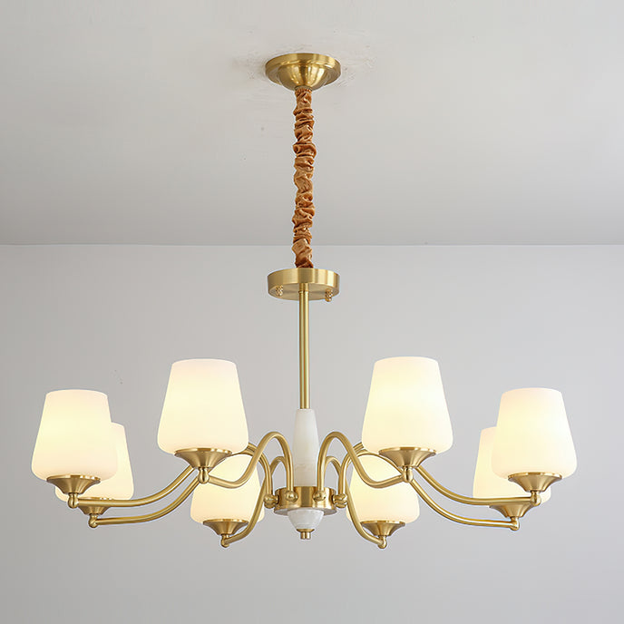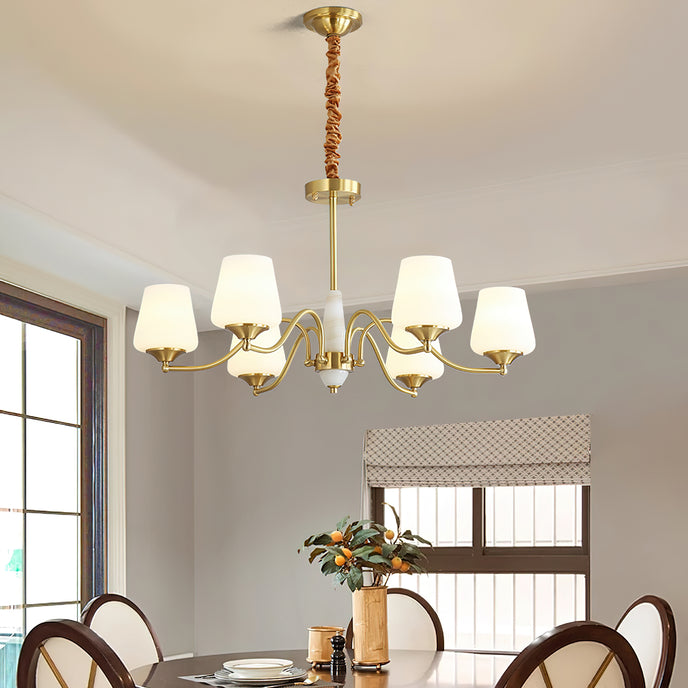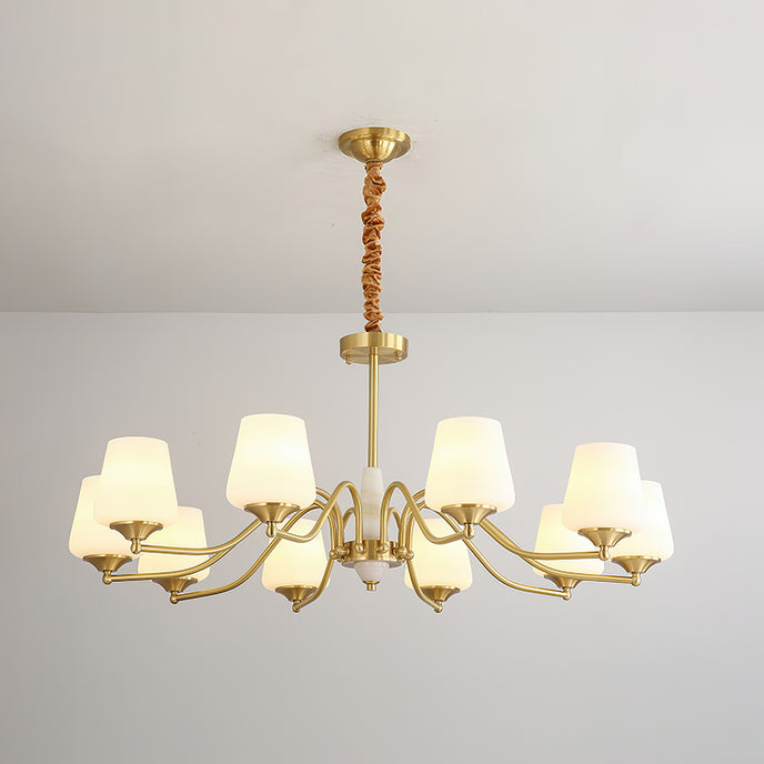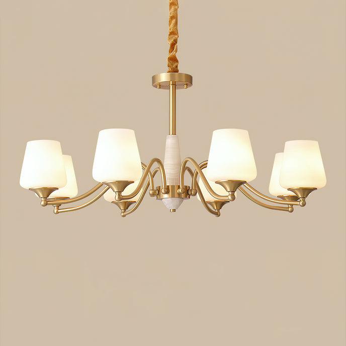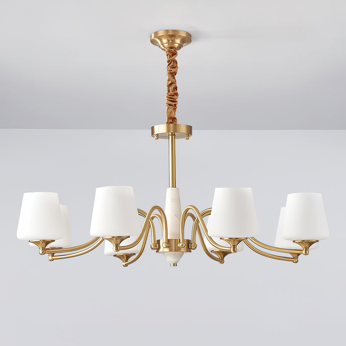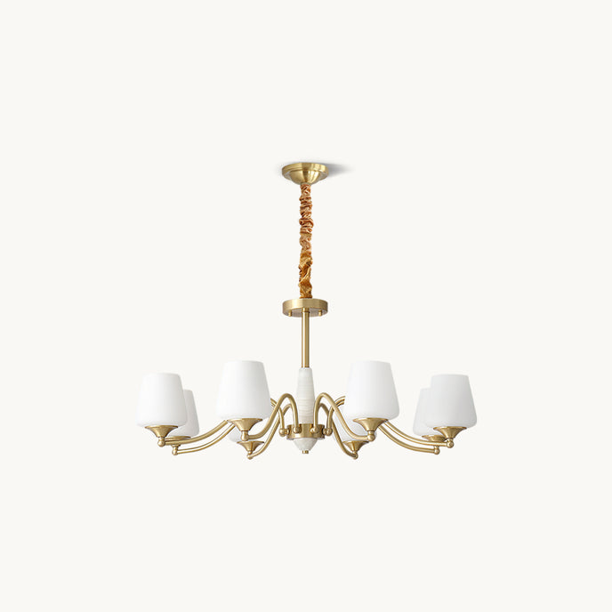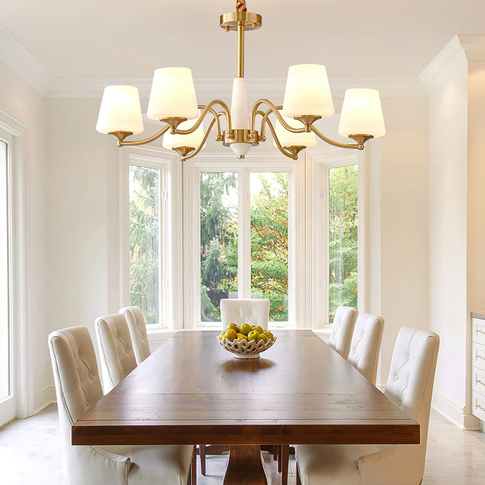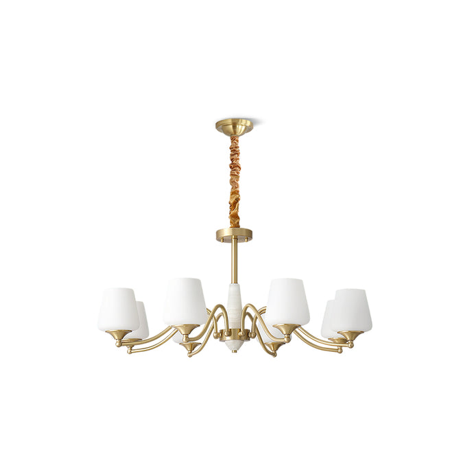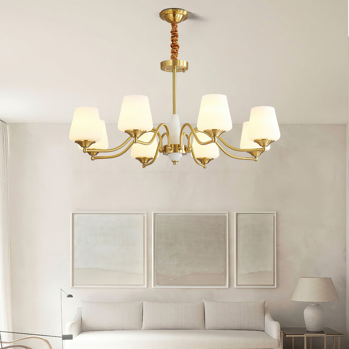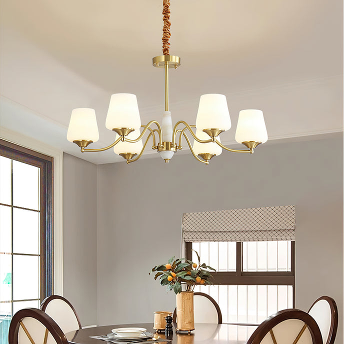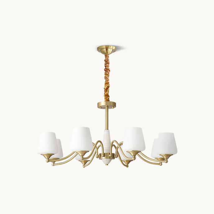 ارفع مساحة منزلك من خلال الثريا الزجاجية الأمريكية. يضيف الجسم النحاسي المتين والقوس الناعم لمسة من الأناقة، بينما ينبعث أغطية المصابيح المصنوعة من اليشم الطبيعي والزجاج المصنفر وهجًا أبيض حليبيًا لطيفًا. حوّل مساحتك إلى واحة هادئة مع هذه الثريا المذهلة.