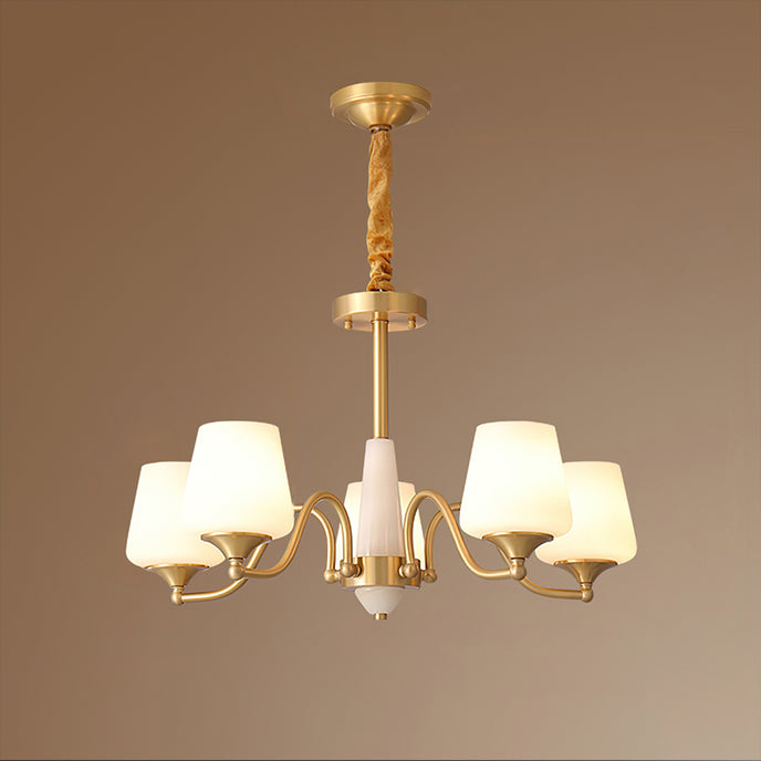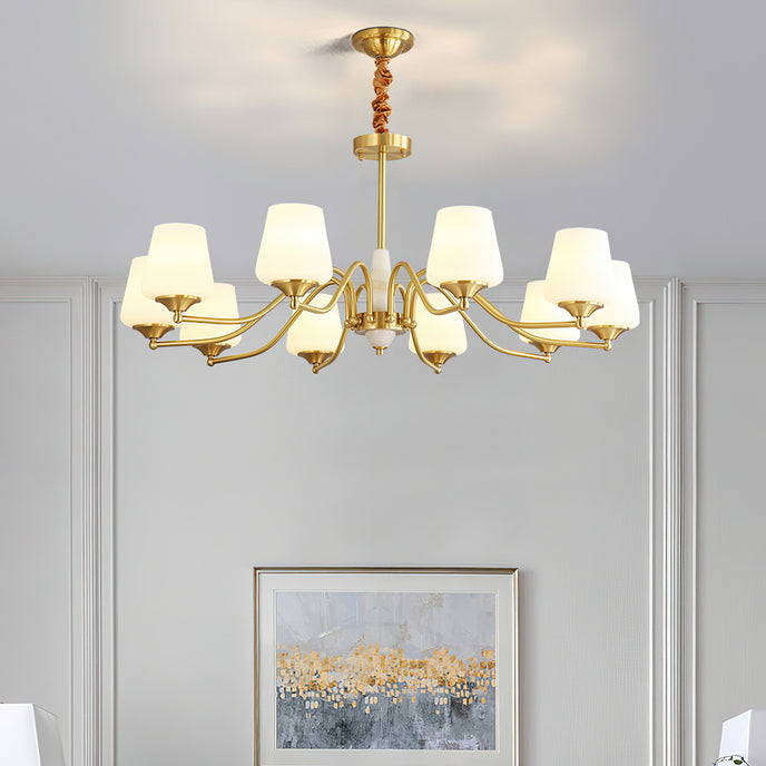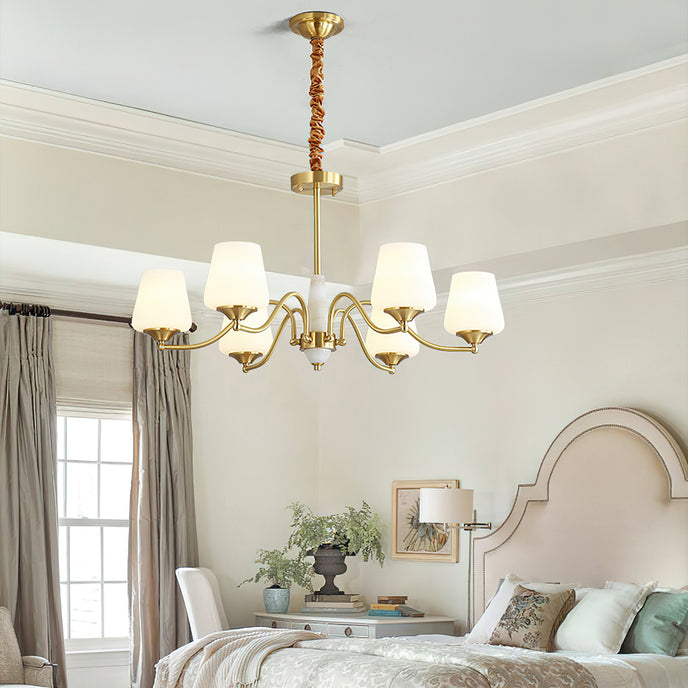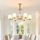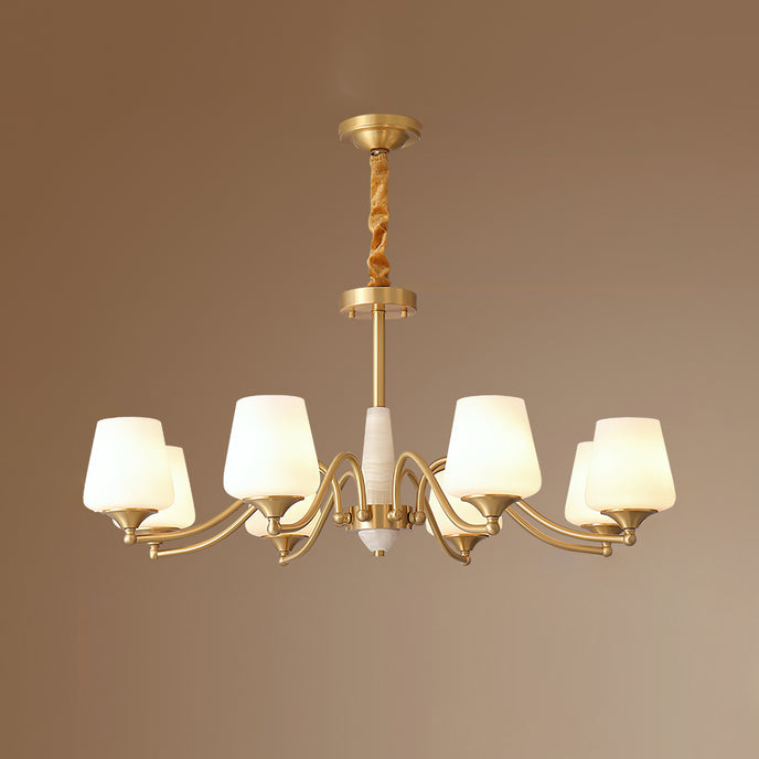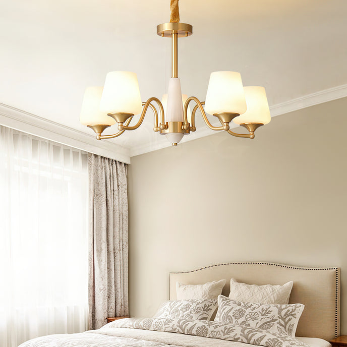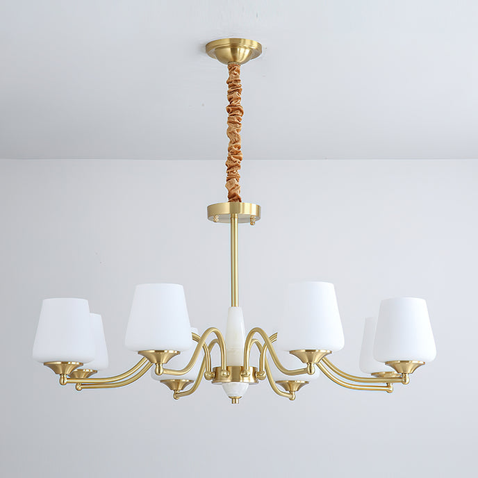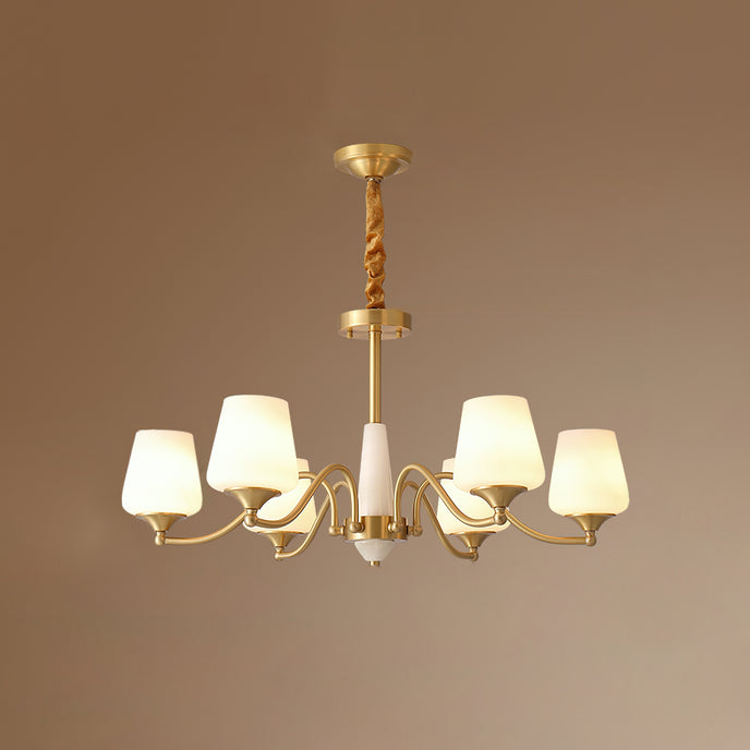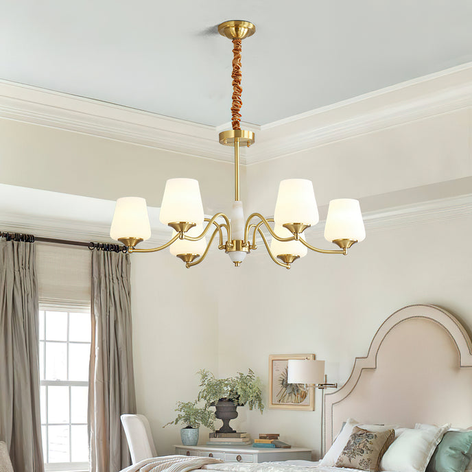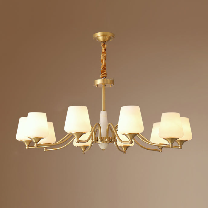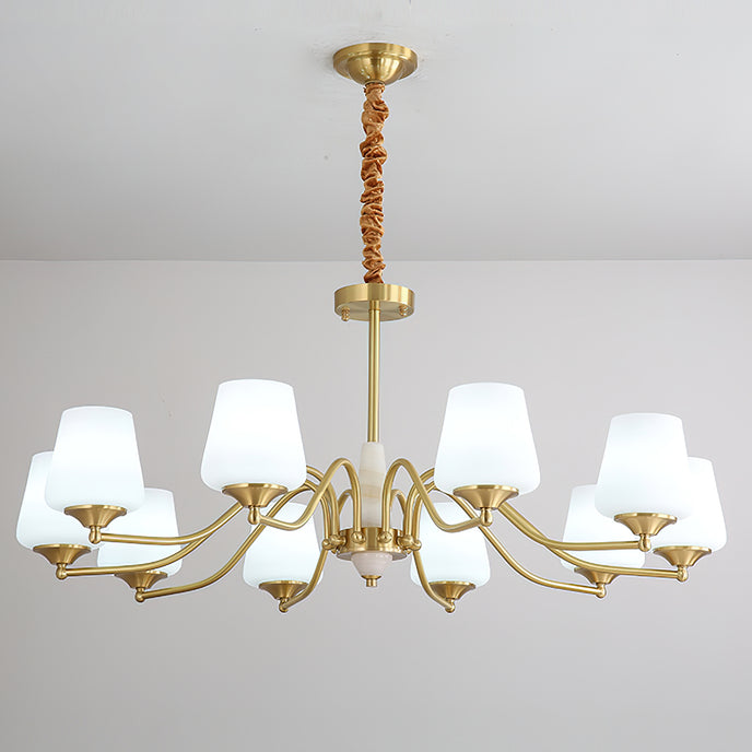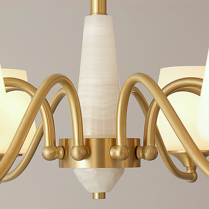 ارفع مساحة منزلك من خلال الثريا الزجاجية الأمريكية. يضيف الجسم النحاسي المتين والقوس الناعم لمسة من الأناقة، بينما ينبعث أغطية المصابيح المصنوعة من اليشم الطبيعي والزجاج المصنفر وهجًا أبيض حليبيًا لطيفًا. حوّل مساحتك إلى واحة هادئة مع هذه الثريا المذهلة.