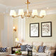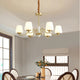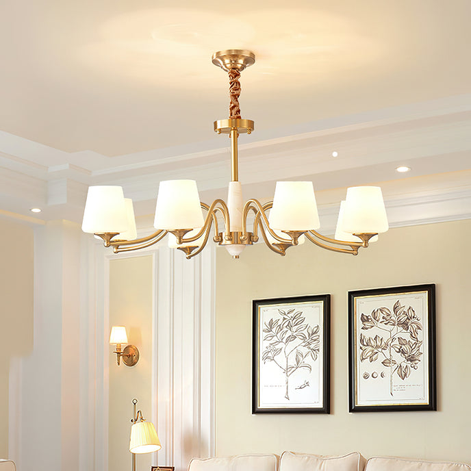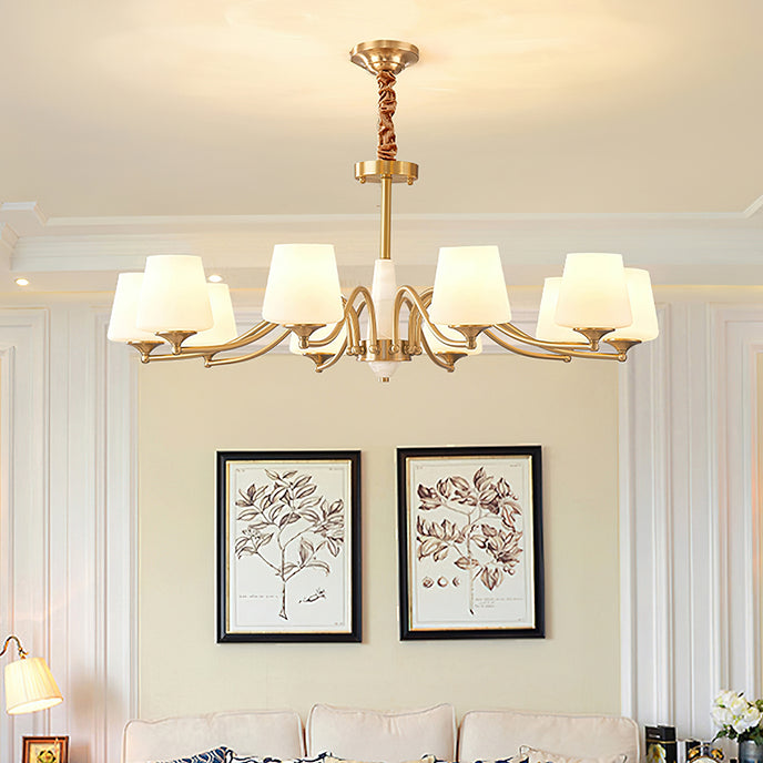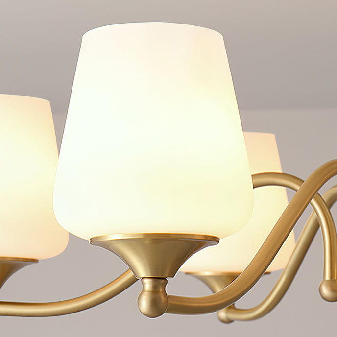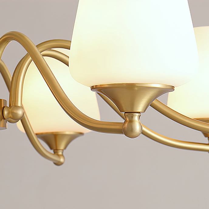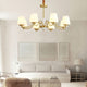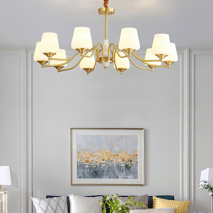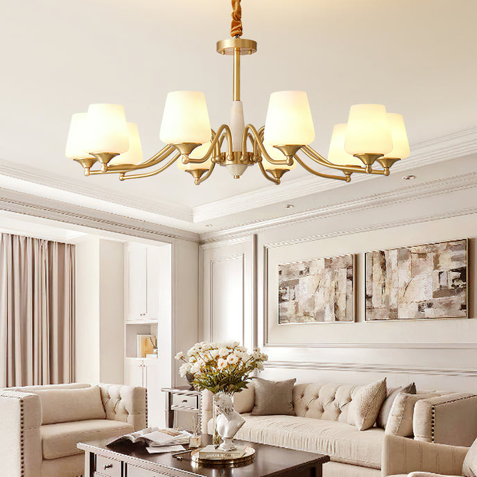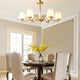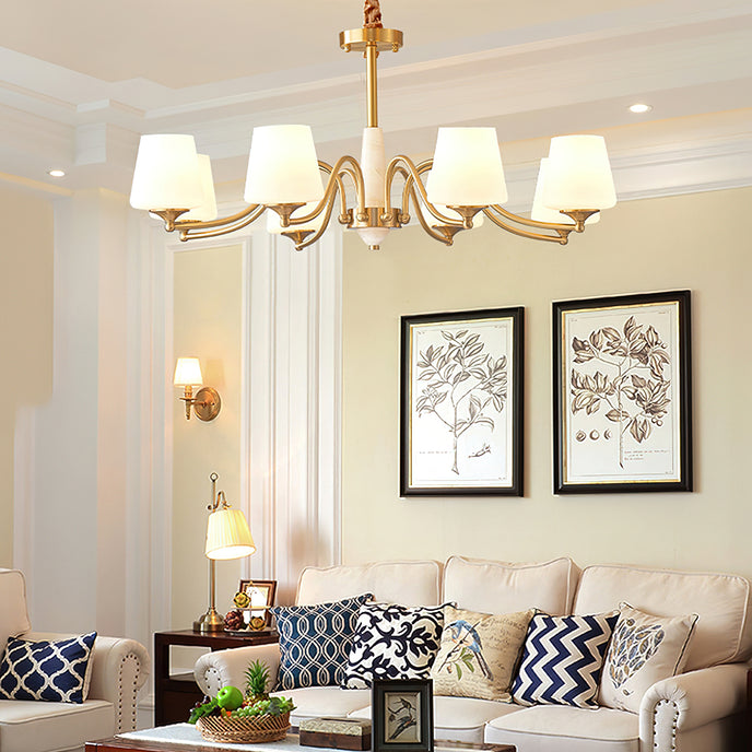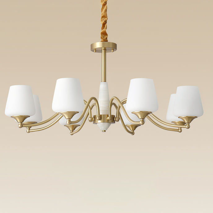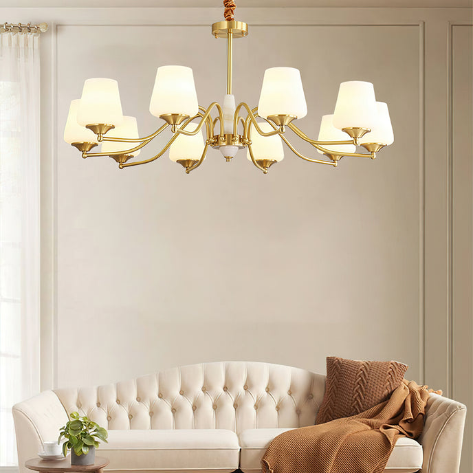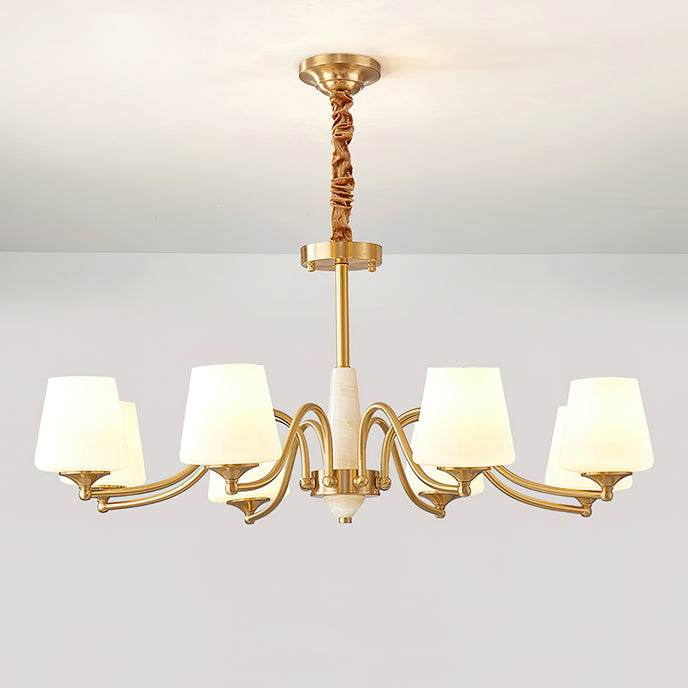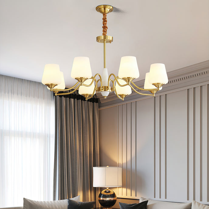 ارفع مساحة منزلك من خلال الثريا الزجاجية الأمريكية. يضيف الجسم النحاسي المتين والقوس الناعم لمسة من الأناقة، بينما ينبعث أغطية المصابيح المصنوعة من اليشم الطبيعي والزجاج المصنفر وهجًا أبيض حليبيًا لطيفًا. حوّل مساحتك إلى واحة هادئة مع هذه الثريا المذهلة.