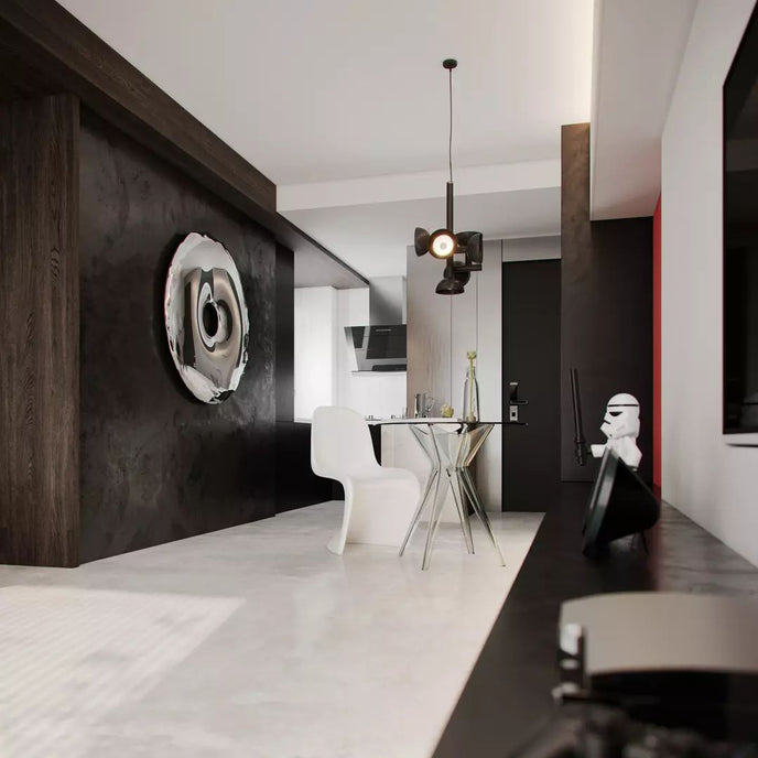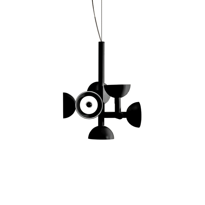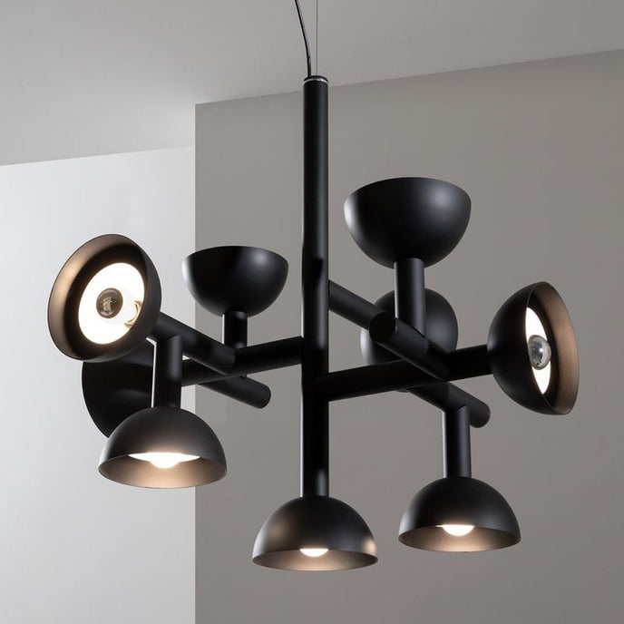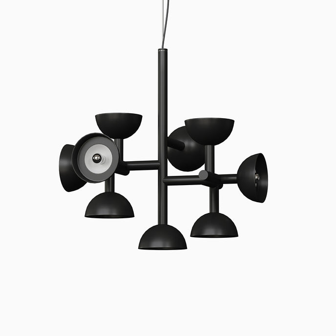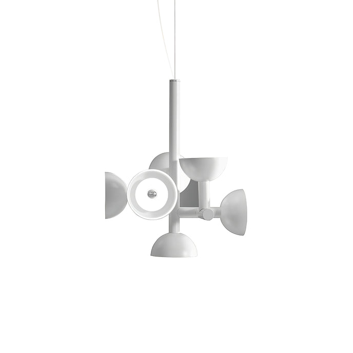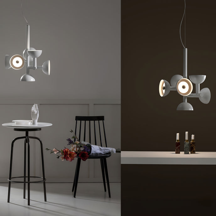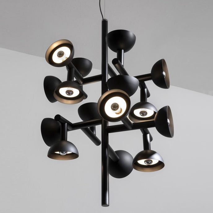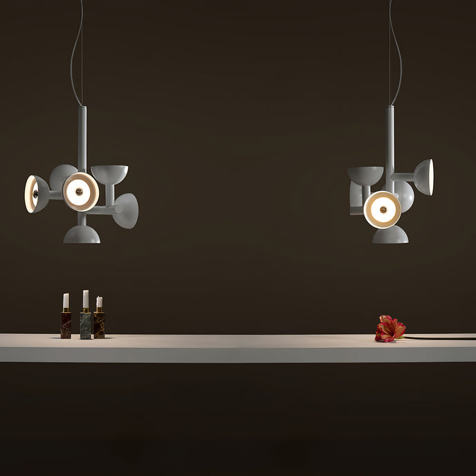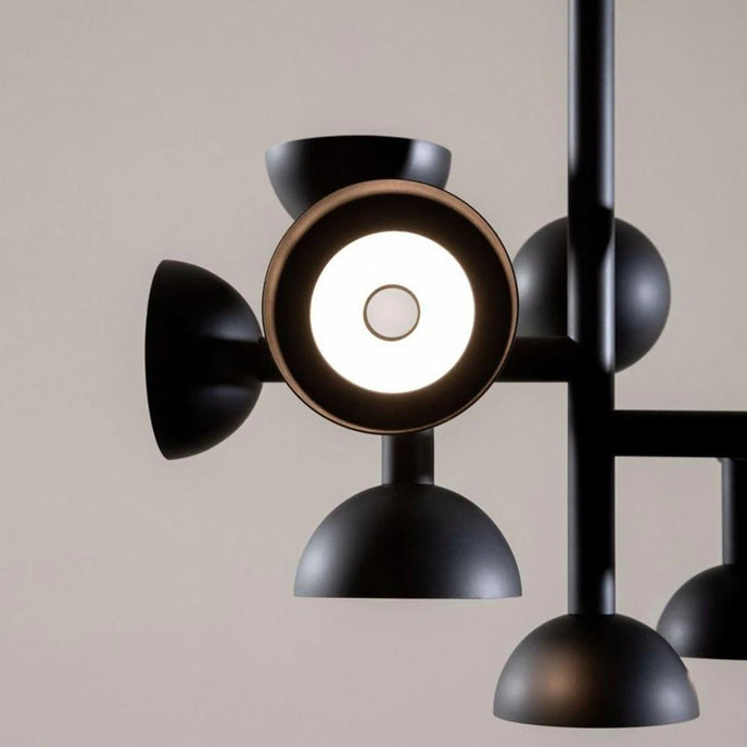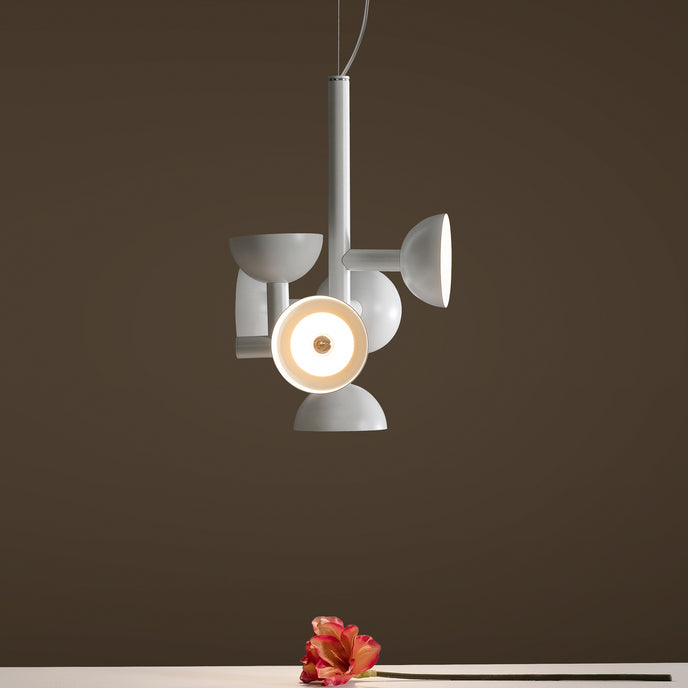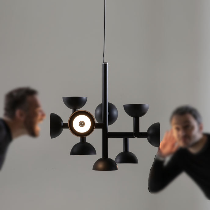 العرافة، صوت النور. يبرز قضيب حديدي مركزي في أذرع أفقية وعمودية مغطاة بقباب تنشر الضوء. يتم توجيه دفعات الضوء في جميع الاتجاهات مثل الموجات الصوتية من إطار معلق ينعش المساحة المحيطة بجرأة رسومية معبرة مستوحاة من De Stijl. استحضارًا لأسطورة العرافات، الذين اشتهروا باستجوابهم لاستنباط النبوءات، تم تصميم هذا الضوء كما لو كان صوتًا يسافر عبر الفضاء، مما يجعل صوته المشع مسموعًا لأنه ينضح بشعور بالشاعرية والتطبيق العملي.