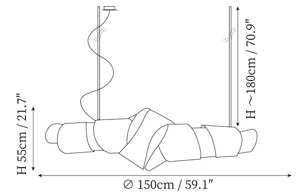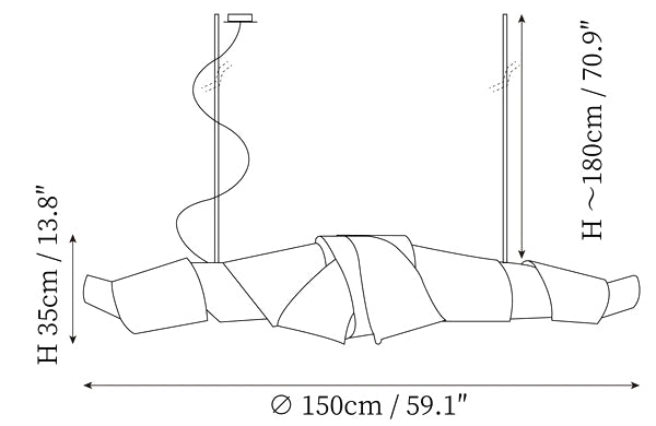 ثريا كاتربيلر ذات ضوء منتشر ومباشر. يتكون الناشر من شريط ورقي مقترن بطبقة رقيقة من البوليمر التقني ملفوفة بطريقة غير رسمية على ما يبدو حول الإطار. حامل معدني مطلي بمسحوق الإيبوكسي، وموزع PMMA مقذوف بلمسة نهائية من الساتان يحتوي على مصدر الضوء. كابلان تعليق من الفولاذ المقاوم للصدأ مع ملحق سقف ميكانيكي من الفولاذ بلمسة نهائية من الساتان وكابل كهربائي شفاف.