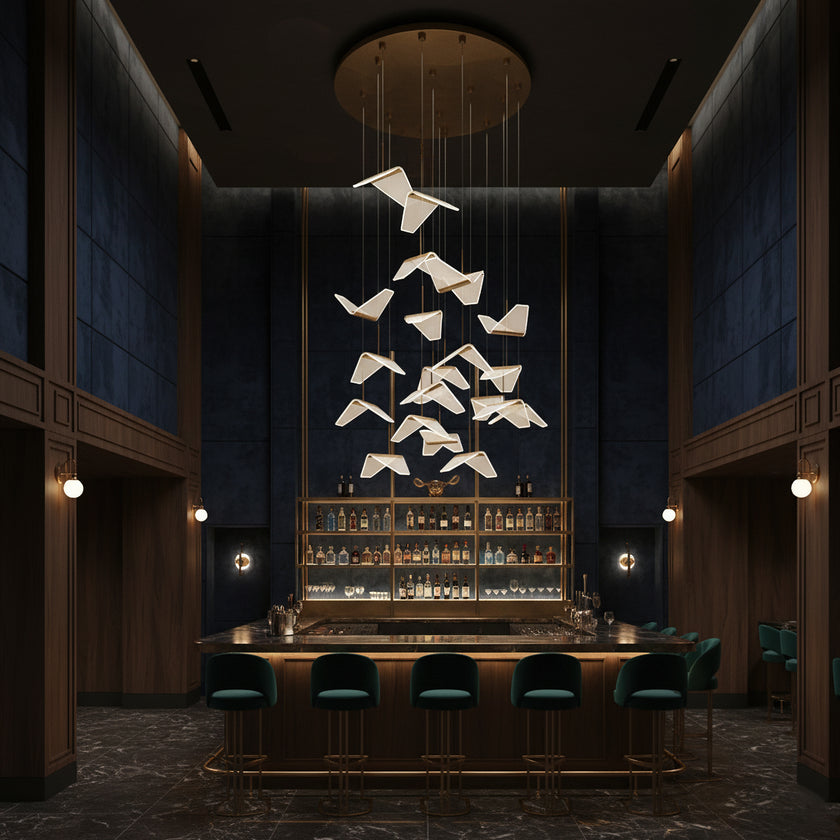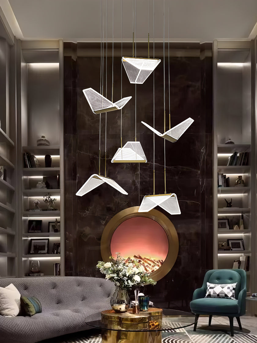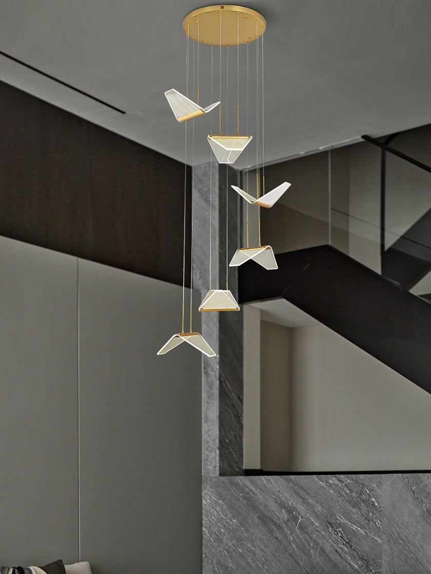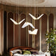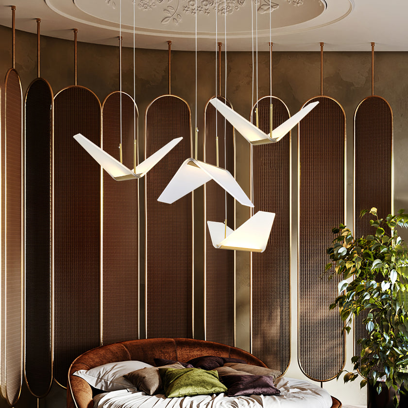 مصباح قلادة الجناح الإبداعي ذو الشكل ما بعد الحداثة، مثل أجنحة طيور النورس الطائرة، وعاكس الضوء الأكريليكي الذي ينقل الضوء العالي، ومصدر ضوء LED، ودمج العناصر الجمالية الحديثة وأزياء الفنانين في الإضاءة، وأنيق وجو، وبسيط ولكن ليس منخفضًا الشكل، ذكي وأنيق، يبدو وكأنه يطير في أي لحظة.
