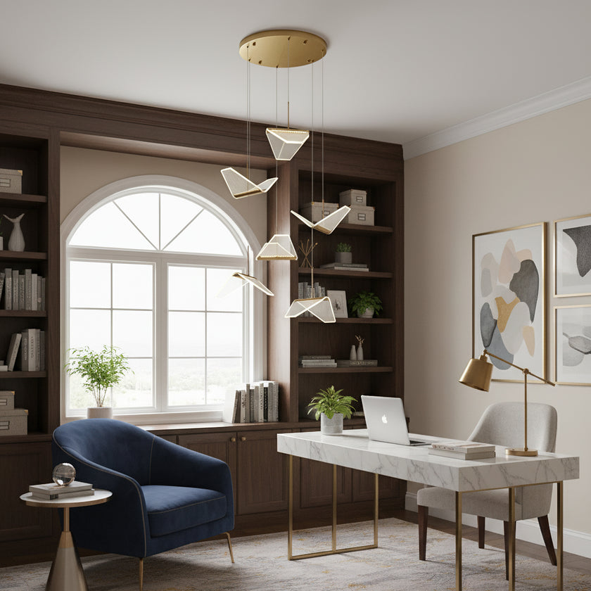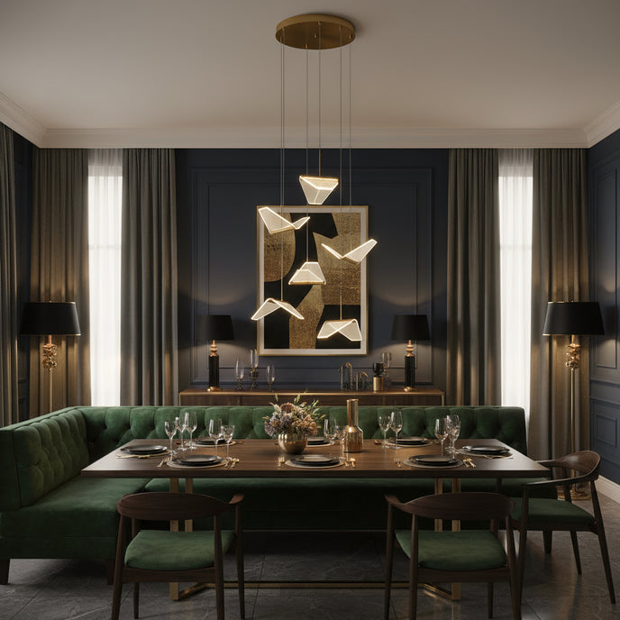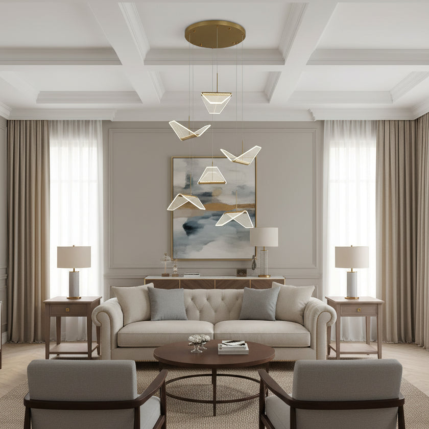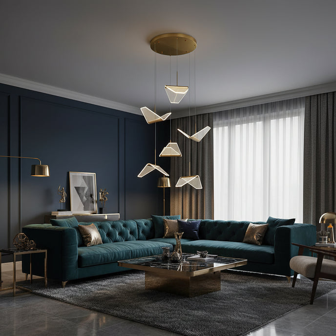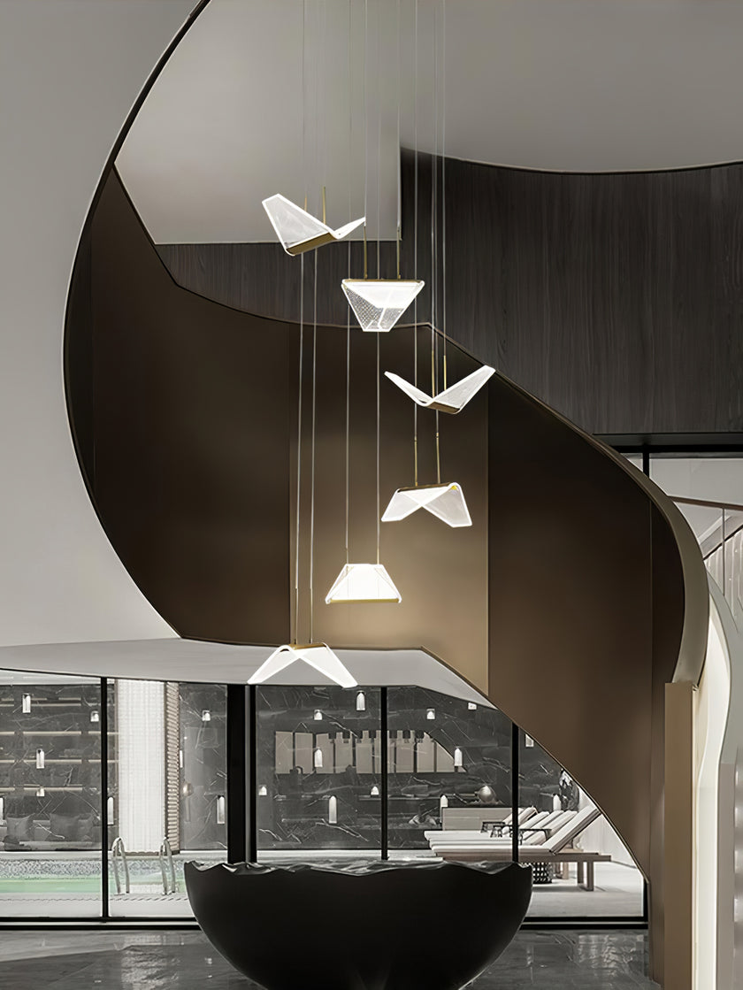 مصباح قلادة الجناح الإبداعي ذو الشكل ما بعد الحداثة، مثل أجنحة طيور النورس الطائرة، وعاكس الضوء الأكريليكي الذي ينقل الضوء العالي، ومصدر ضوء LED، ودمج العناصر الجمالية الحديثة وأزياء الفنانين في الإضاءة، وأنيق وجو، وبسيط ولكن ليس منخفضًا الشكل، ذكي وأنيق، يبدو وكأنه يطير في أي لحظة.