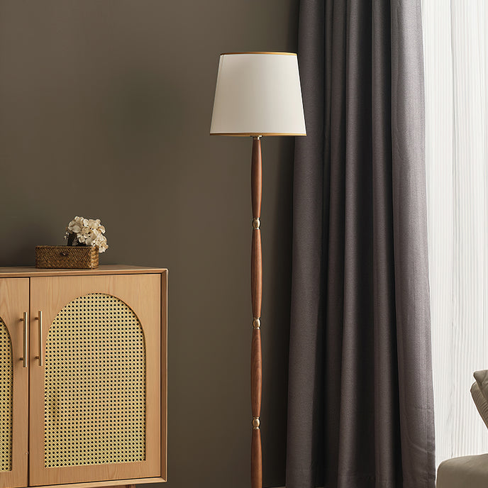 The Adaire Floor Lamp by Mooijane embodies timeless sophistication through refined simplicity. Its slender, tapered wood column is accented with polished metal hardware, creating a harmonious balance of warm and cool tones. Topped with a classic fabric shade edged in gold trim, it softly diffuses light, adding a warm and inviting ambiance to living rooms, bedrooms, or study spaces.
