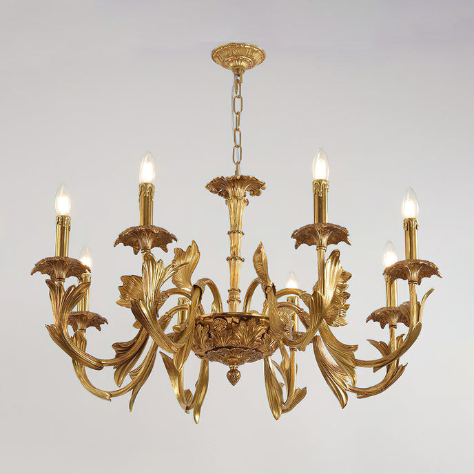 The Adeline Chandelier by Mooijane showcases classical grandeur and exquisite craftsmanship. Finished in rich gold, its sculptural arms feature delicate leaf motifs inspired by baroque artistry. Candle-style lights cast a warm, radiant glow, enhancing the chandelier’s regal character. Perfect for dining rooms, grand foyers, or formal living spaces, this timeless piece brings an aura of elegance and sophistication to any interior.