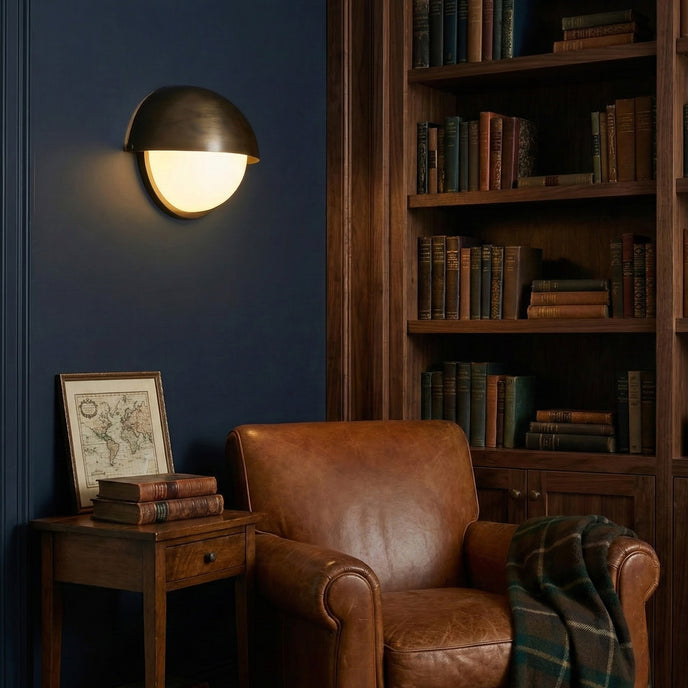 The Bahia Wall Light by Mooijane offers a versatile, modern design with a rotatable lampshade that allows you to direct light upwards or downwards. Crafted from antique brass and complemented by a milky white glass shade, this wall lamp combines functionality with elegance, adding a refined touch to any space.