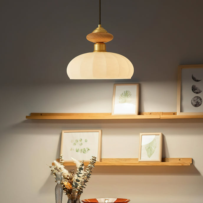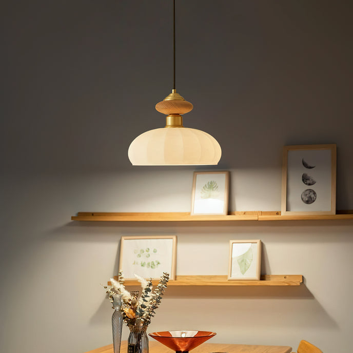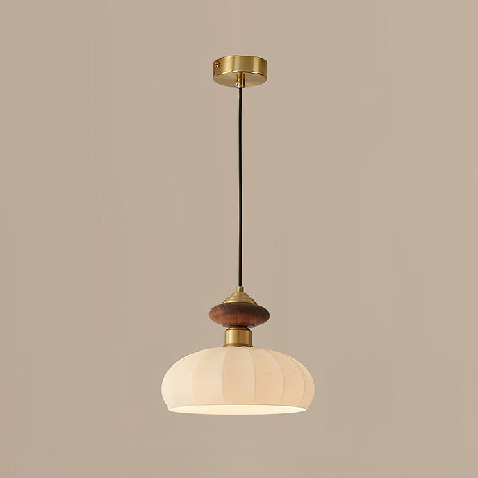Update your dining room with the Bailey Glass Pendant Light from Mooijane. Crafted from walnut wood with brass accents and a glass shade, this vintage lamp adds retro charm to any occasion.