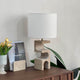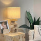 The Boveda Table Lamp from Mooijane effortlessly combines modern elegance with earthy charm. Its sculptural base, crafted from durable travertine, features sleek curves and arches that create a striking visual impact. The soft fabric shade enhances the lamp's warmth, offering a gentle, diffused light. The natural texture of the stone contrasts beautifully with the refined simplicity of the fabric, making this lamp a standout piece in any space.