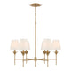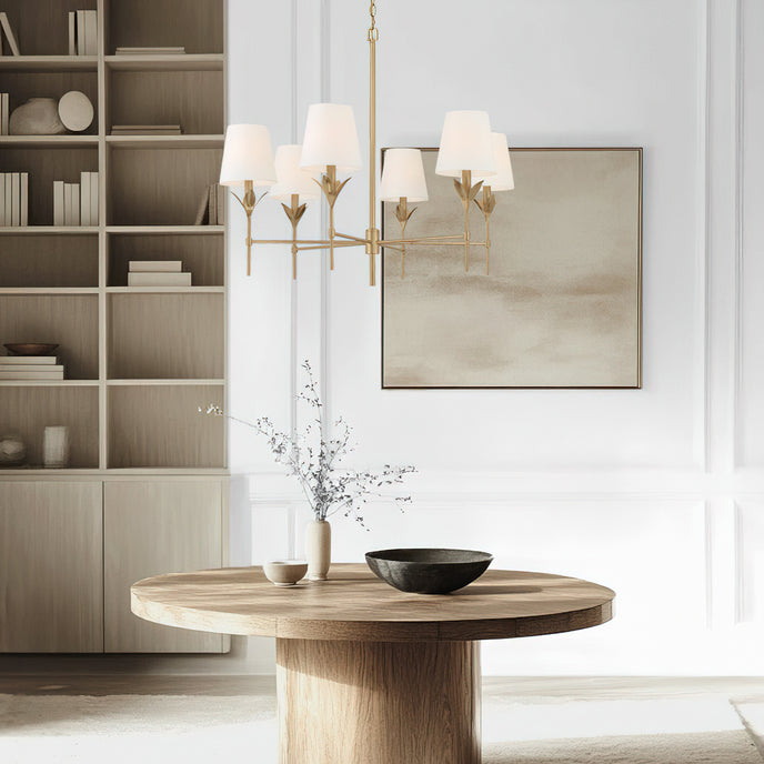 The Broche 6-Light Chandelier by Mooijane blends traditional elegance with modern design. Featuring a candelabra-style frame and white linen shades, it’s complemented by layered wrought iron leaves that create a beautiful, functional light display. Perfect for bedrooms, living rooms, or kitchens, it adds refined glamour to any transitional or modern space.