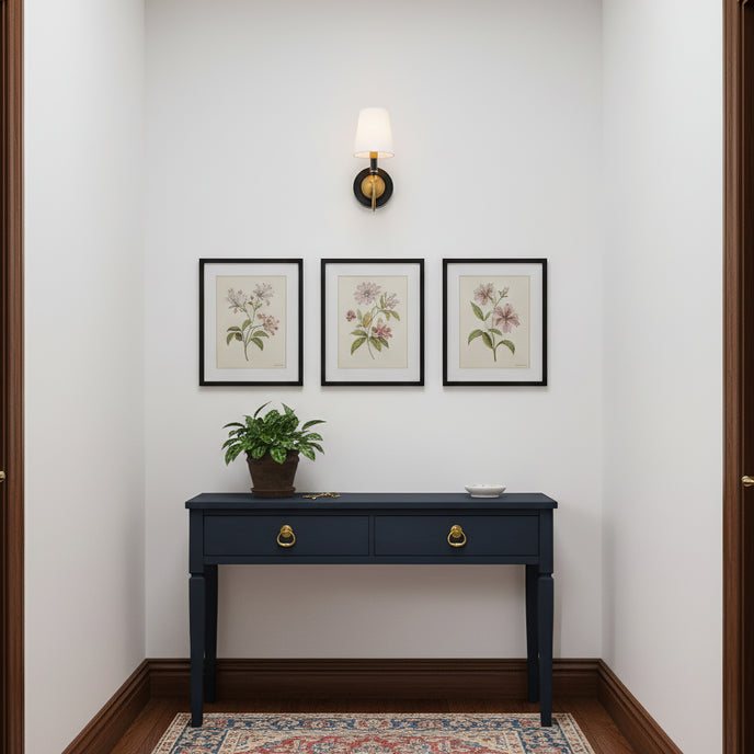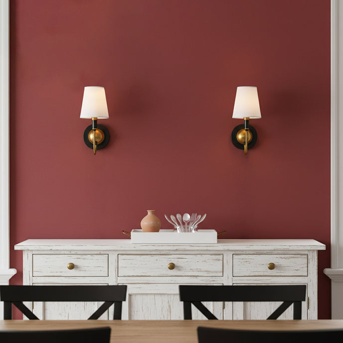 The Bryant Wall Lamp from Mooijane blends brass and fabric in perfect harmony, capturing timeless charm with a touch of modern refinement. Its brushed brass body radiates a warm, elegant glow, while the smooth curved arm and white fabric shade diffuse soft, inviting light. The refined black-and-gold palette adds depth and sophistication, making the Bryant an ideal accent for both contemporary and classic interiors.