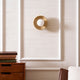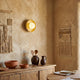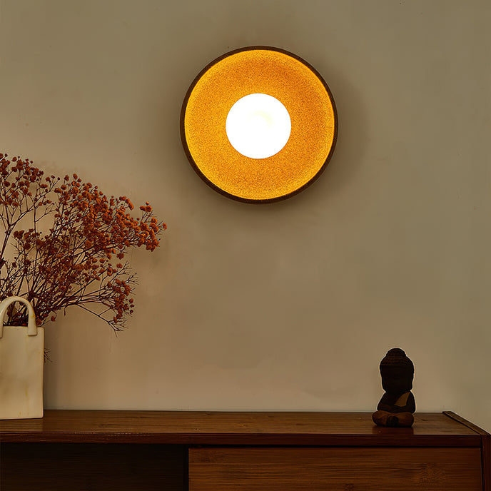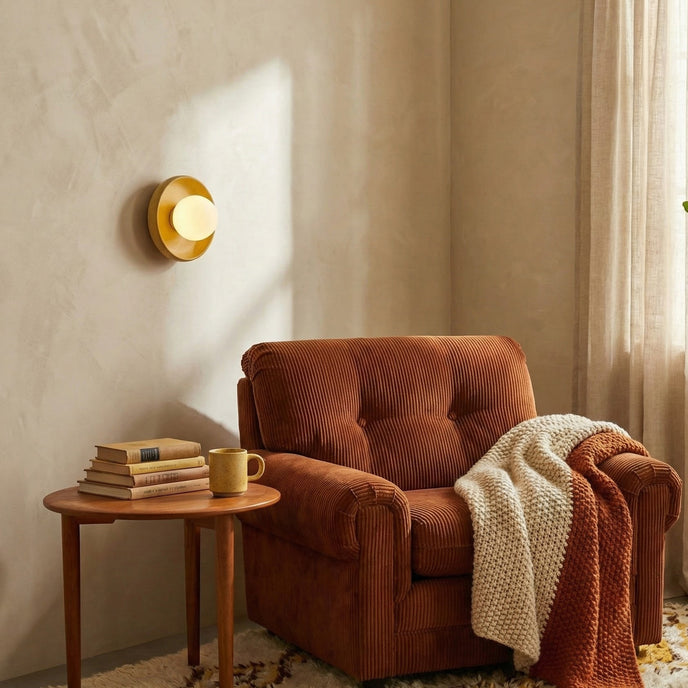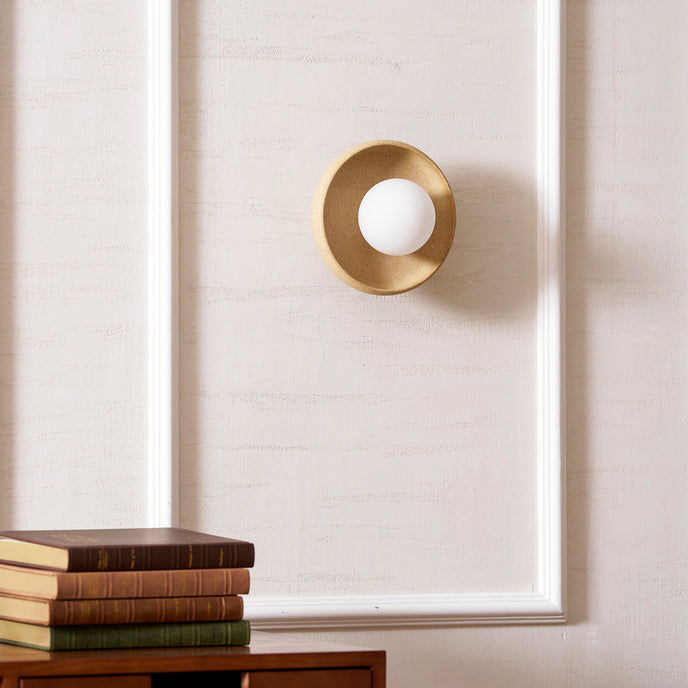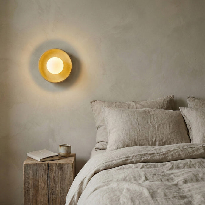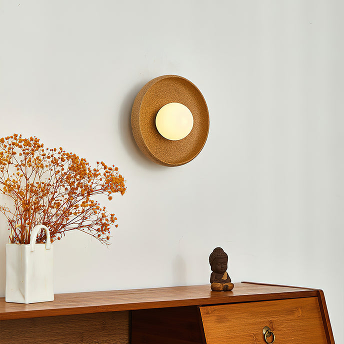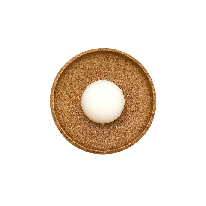 With its minimalist, circular design, the Dusk wall lamp exudes warmth and simplicity. Its deep, textured brown surface surrounds a central white sphere, emitting a soft, comforting glow. The earthy tones combined with the clean, modern shape make this wall lamp perfect for understated elegance in a hallway, bedroom or living space. Its design blends warmth with modern simplicity to create a calming ambience.