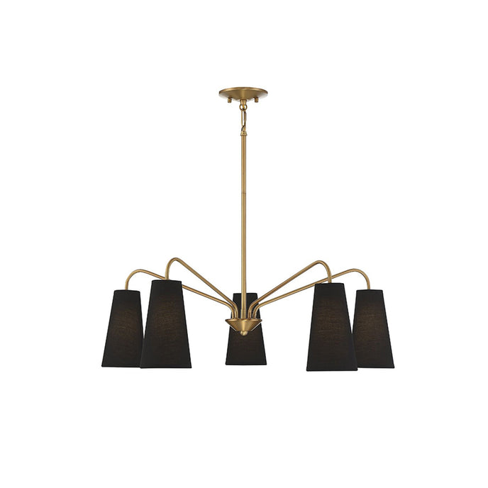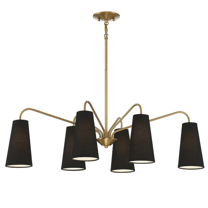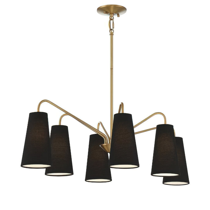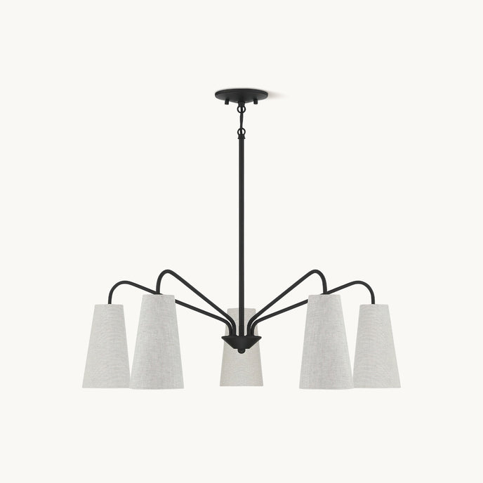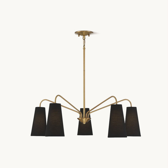 The Edgewood Chandelier by Mooijane pairs a tall, tapered black fabric shade with a warm brass finish for a look that is both modern and timeless. Its clean silhouette adds effortless sophistication, making it an ideal choice for enhancing dining rooms, living areas, or entryways with a refined glow.