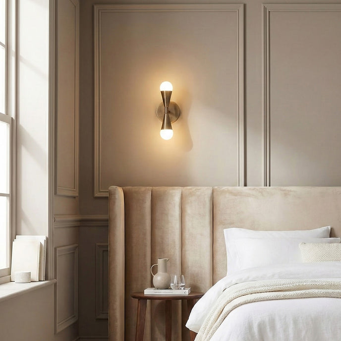 The Karma Wall Sconce by Mooijane features a sculptural brass form that feels both modern and timeless. Opposing cone-shaped shades create a clean visual rhythm, while the brushed brass finish adds warm, understated elegance. When illuminated, it delivers a soft, even glow that enhances the wall without glare—ideal for hallways, bathrooms, or as a statement accent in living spaces.