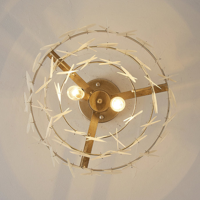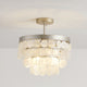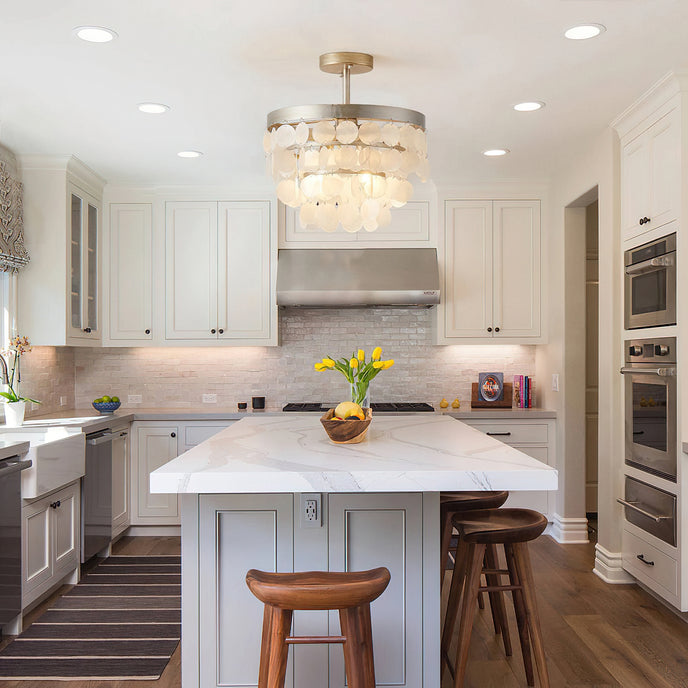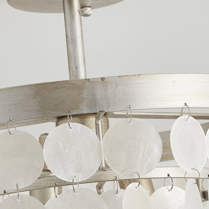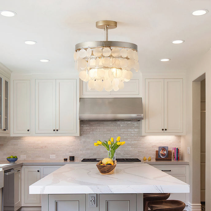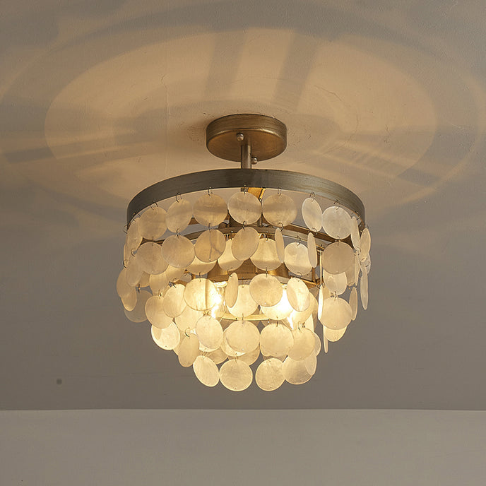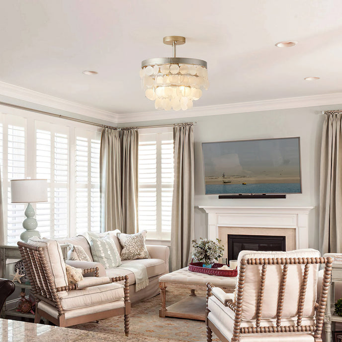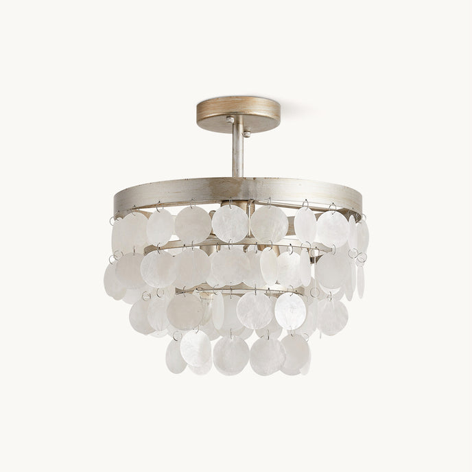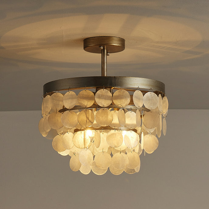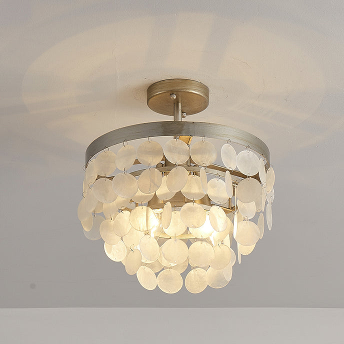 The Lusteria Ceiling Light by Mooijane brings coastal elegance to any space. Featuring three layers of natural seashells suspended in an antique nickel frame, this semi-recessed fixture casts a soft, diffused glow through its two-light candlestick base. Ideal for hallways, bedrooms, or entryways with low ceilings, it adds a touch of natural charm and subtle sophistication to your home. LED bulbs are recommended for optimal illumination.