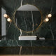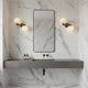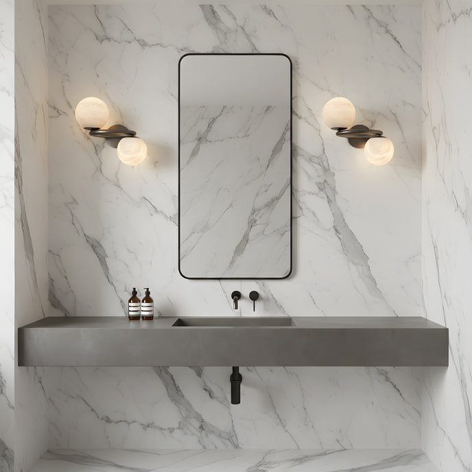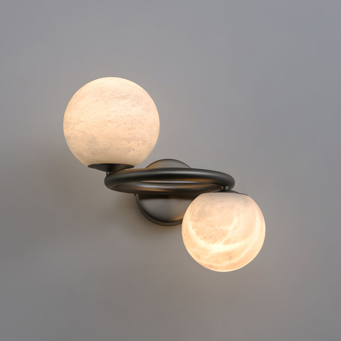 The Murray Wall Lamp from Mooijane pairs a sleek metal frame with two glowing alabaster globes for a modern, sculptural presence. Each natural alabaster sphere features unique veining, making every piece one of a kind. The warm, diffused light adds a calm, elevated ambiance to hallways, bedrooms, or any space that needs a refined modern glow.