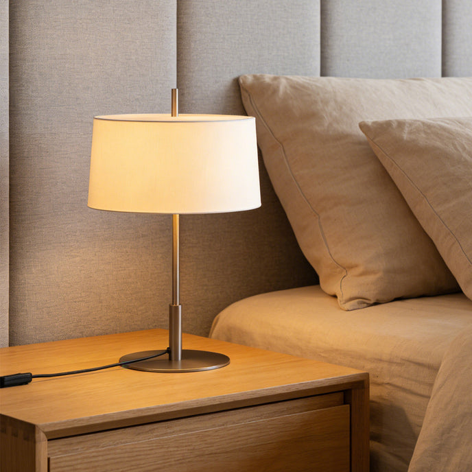 The Orren Table Lamp by Mooijane features a slim, tapered metal stem topped with a smooth conical linen shade. Designed to cast a soft, even glow, it creates a warm and inviting atmosphere—ideal for bedside tables, consoles, or living spaces.