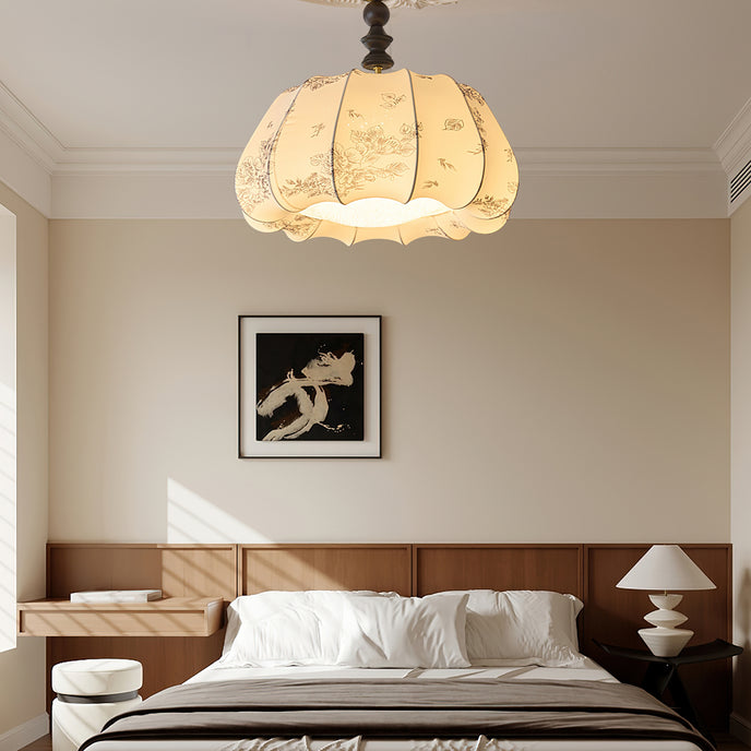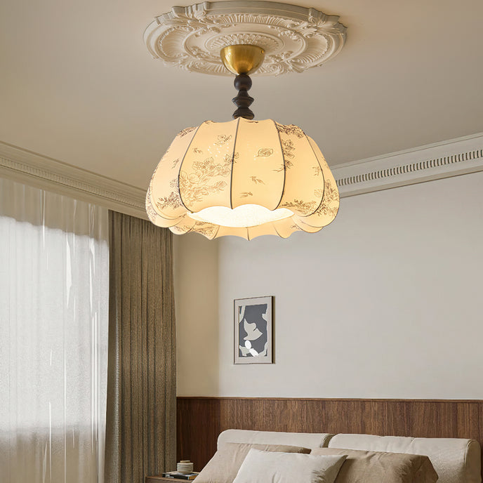 Indulge in elegance with the Pumpkin Blossom Ceiling Lamp from Mooijane. The Pumpkin Blossom Ceiling Lamp features a delicate fabric print shade complemented by metal and wood accents. Exuding a sophisticated, artistic vibe, it's perfect for any space seeking a sense of sophistication.