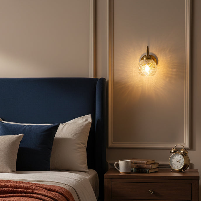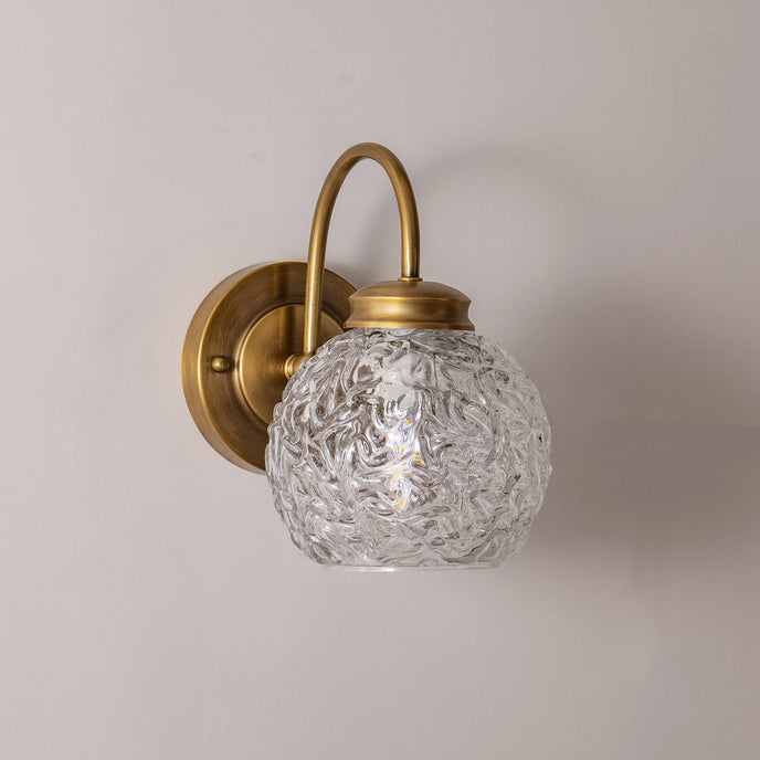 The Renelle Wall Lamp from Mooijane showcases the perfect harmony of fine brass craftsmanship and artful glass design. Its brushed brass frame radiates a warm, vintage sheen, while the hand-textured glass—resembling rippling water—creates a captivating play of light and shadow. With its rounded silhouette and gracefully arched arm, the Renelle balances timeless elegance with modern sophistication.