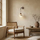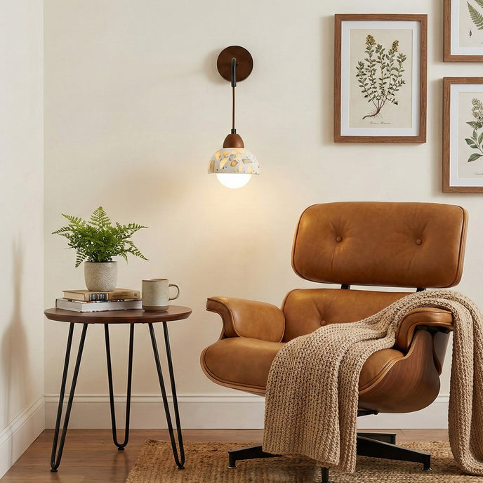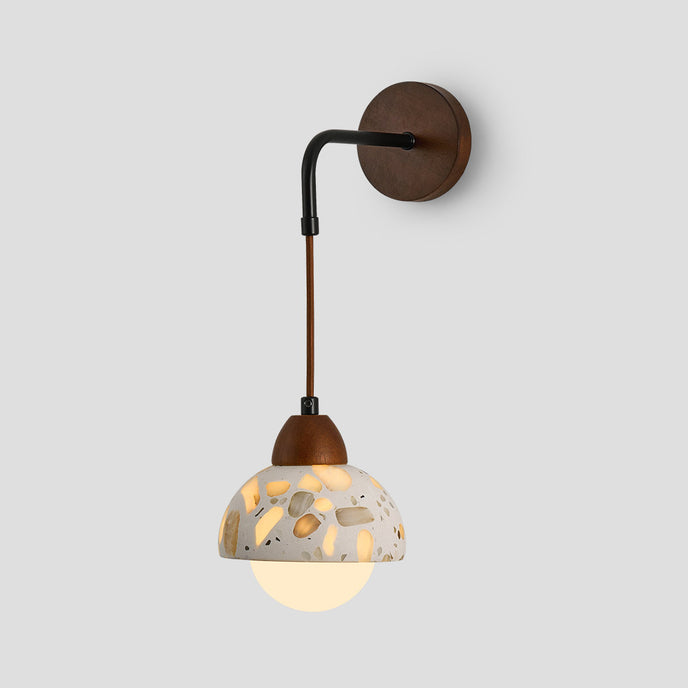The Rigale Wall Lamp by Mooijane seamlessly blends terrazzo, natural wood, and glass for a playful yet thoughtfully designed look. The terrazzo shade adds texture and character with its organic pattern, while the wood detail brings warmth and a handcrafted touch. Below, a softly glowing glass bulb creates a gentle, inviting light that enhances the atmosphere.