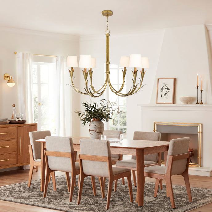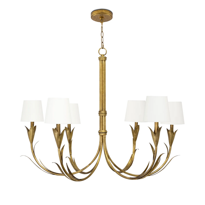 The Ruhlmann Chandelier from Mooijane brings a refined botanical touch to traditional interiors. Featuring gracefully reeded arms and natural linen shades, it evokes organic elegance with a timeless finish. Mounted on a classic round base, this chandelier adds warmth and sophistication to dining rooms, living spaces, or entryways.
