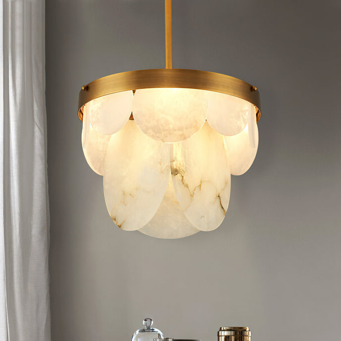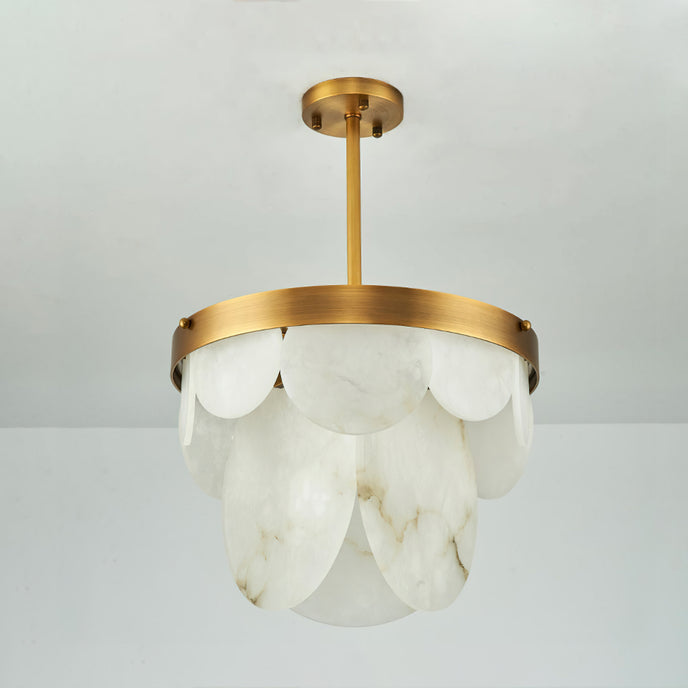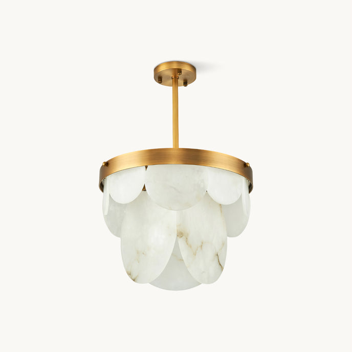 The Sasha Chandelier from Mooijane pairs natural alabaster with polished copper for a refined blend of texture and transparency. Each alabaster element is individually shaped, revealing subtle, organic veining that radiates a warm, ambient glow. Framed by a symmetrical copper structure, it merges vintage charm with contemporary elegance—making it a striking centerpiece for dining rooms, living areas, or entryways.
