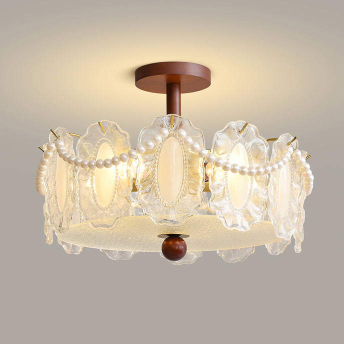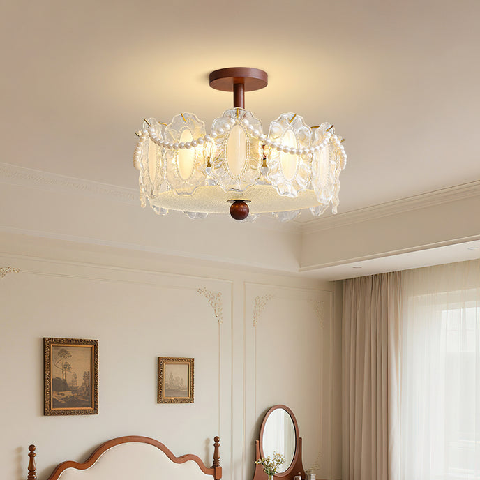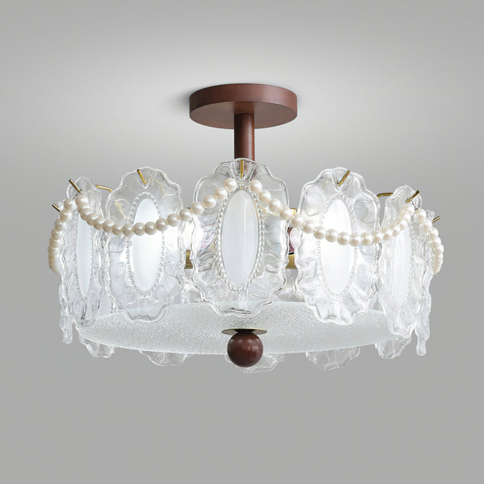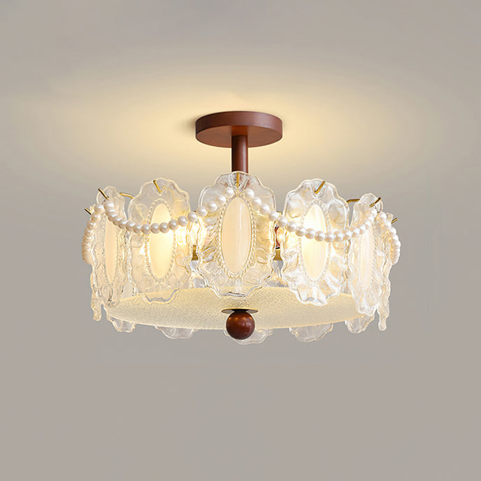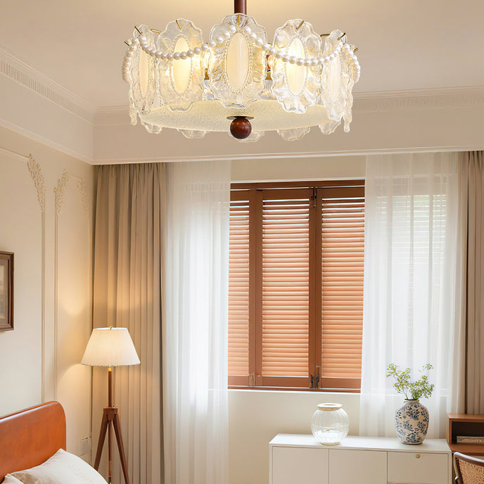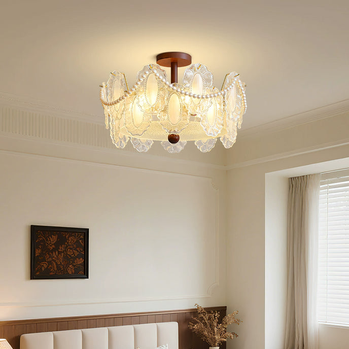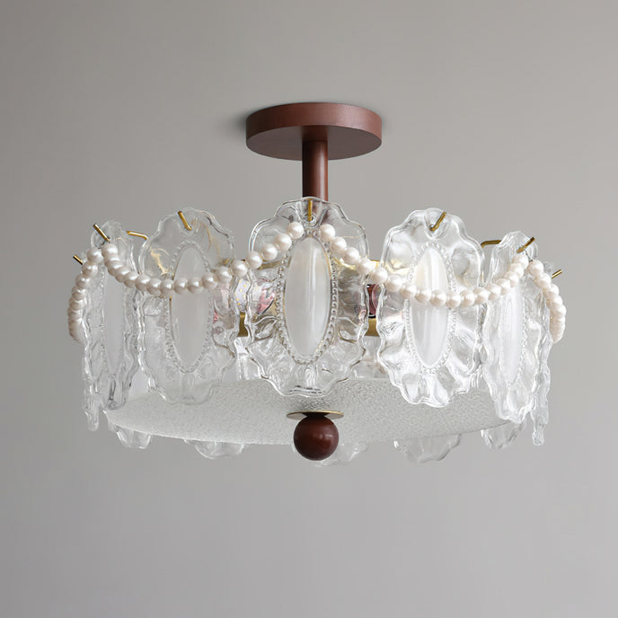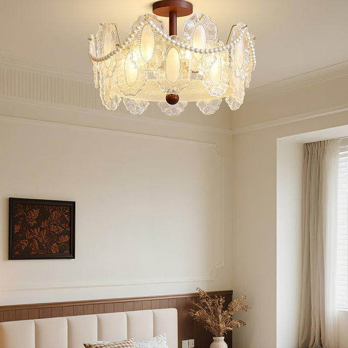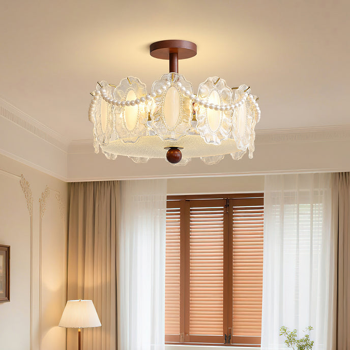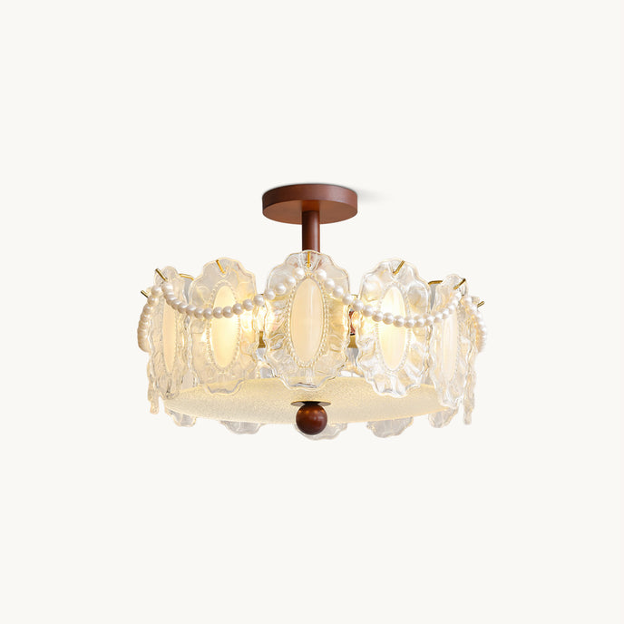 The Shionna Ceiling Light from Mooijane combines metal, glass, and wood to create a striking centerpiece with artistic elegance. Delicate petal-like glass panels shimmer softly, while the sturdy metal frame ensures stability and style. Optional pearl-like chains add a touch of luxury, enhancing its refined character.