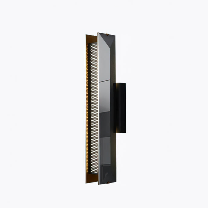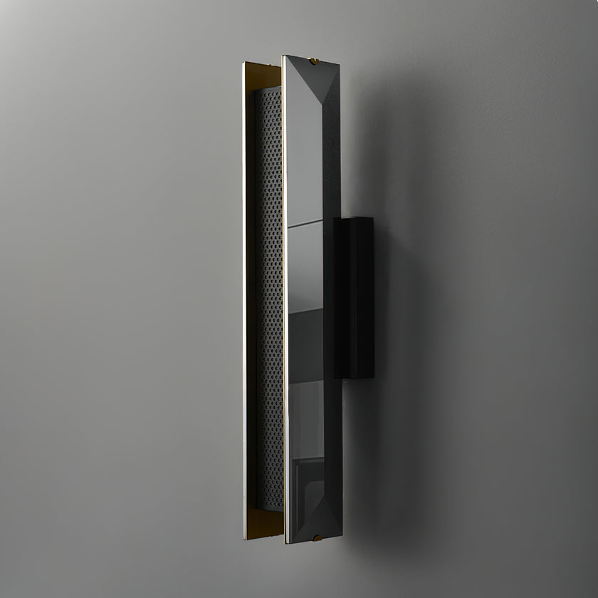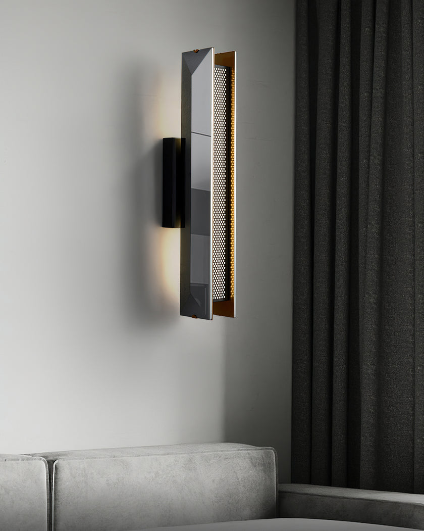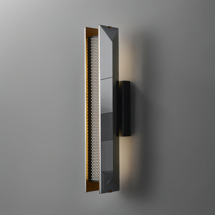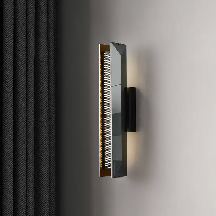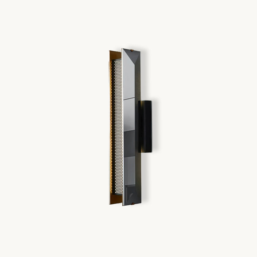 Illuminate your space with sophistication and style with our Stanley Wall Lamp from Mooijan. Its slender body features large glass crystal sides and an anti-glare grille, making it both beautiful and functional. Elevate your decor and create a luxurious ambiance with this unique product.
