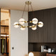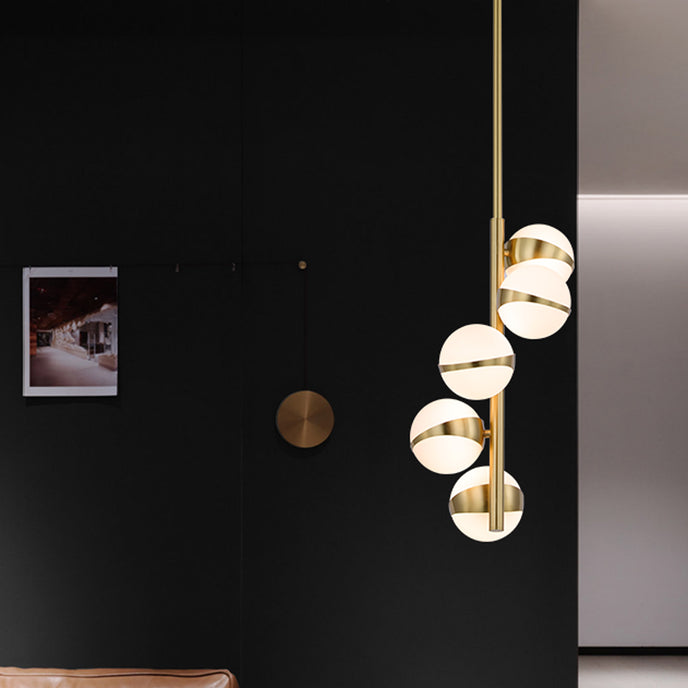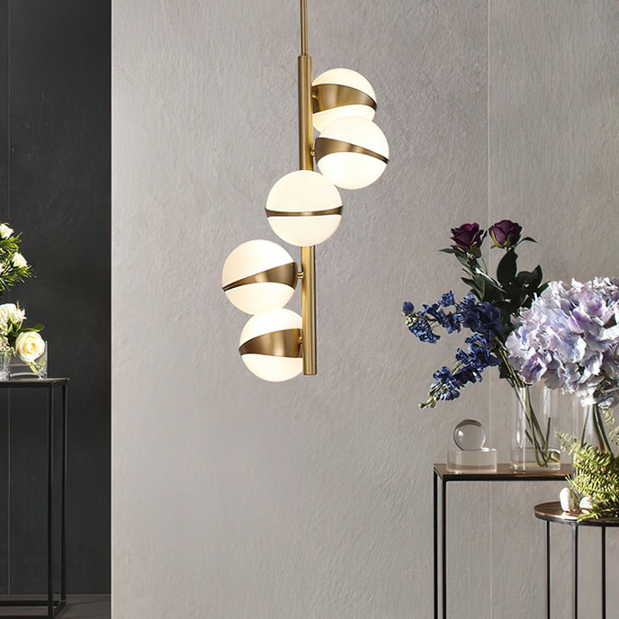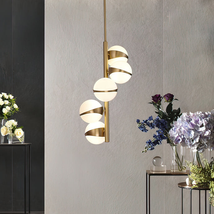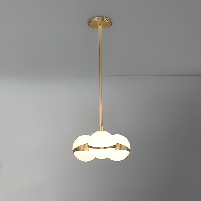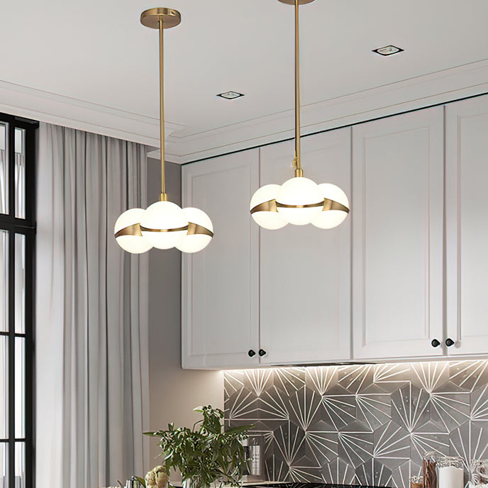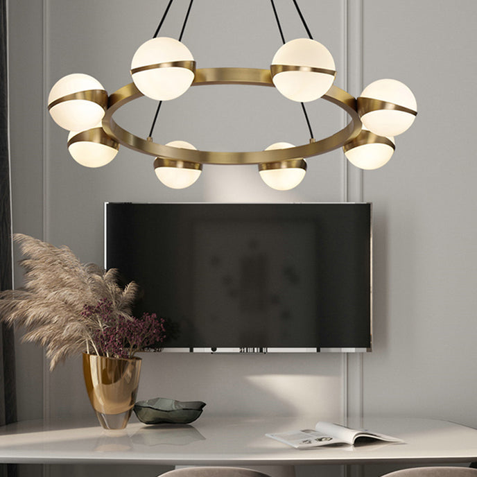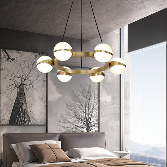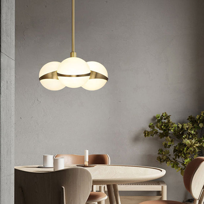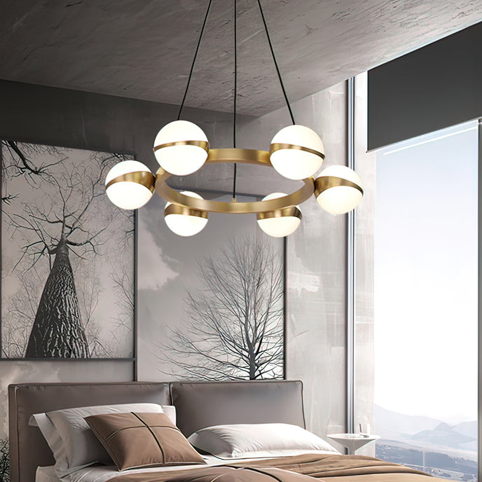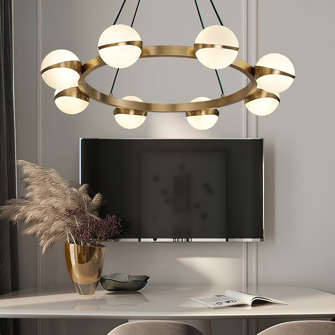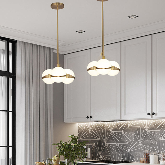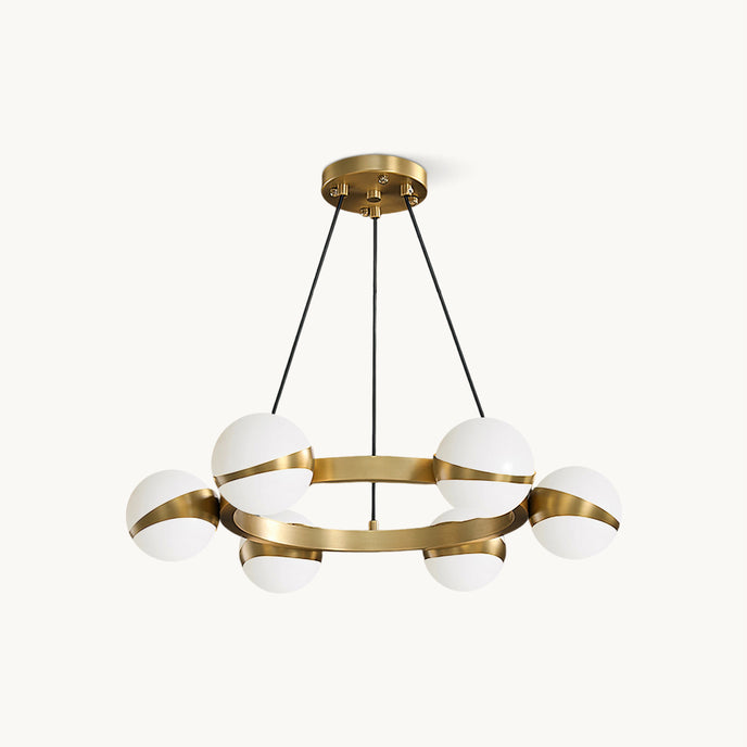 The Tagliato Chandelier by Mooijane is a sophisticated lamp that adds warmth and elegance to any interior space. Carefully crafted in brass and glass, it features a compact round frame with a soft globe that evenly distributes light. Perfect for a dining room, bedroom or cozy living space, it exudes elegance and understated charm.