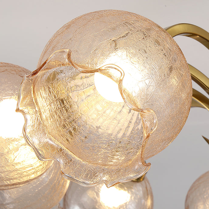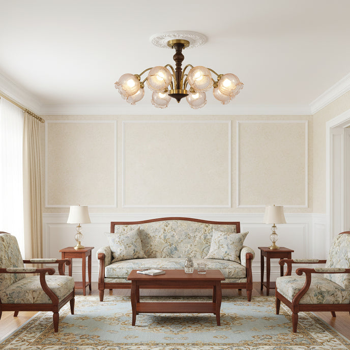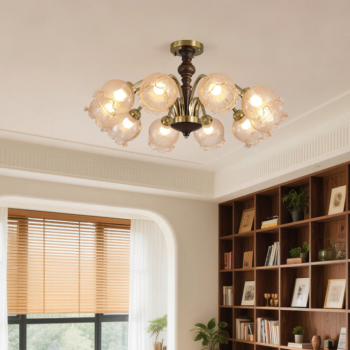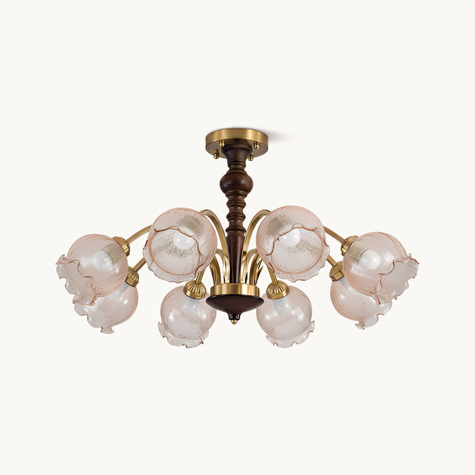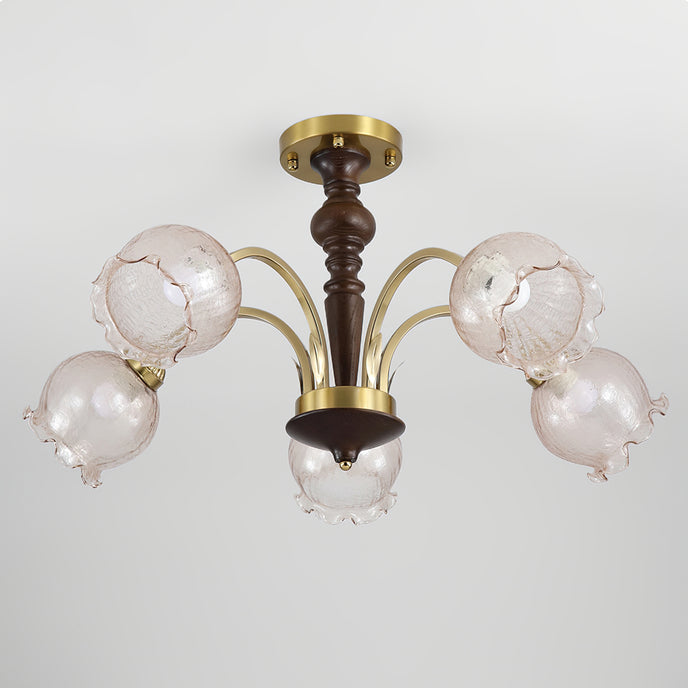 The Talia Ceiling Lamp by Mooijane combines vintage charm with refined craftsmanship. Featuring gracefully curved metal arms and a solid wood centerpiece, it balances texture and color beautifully. The hand-blown glass shade, with pleated petal-like edges and a soft amber tint, diffuses a gentle, inviting glow. Ideal for living rooms, dining areas, or bedrooms, this piece brings a touch of natural elegance and timeless sophistication to any space.