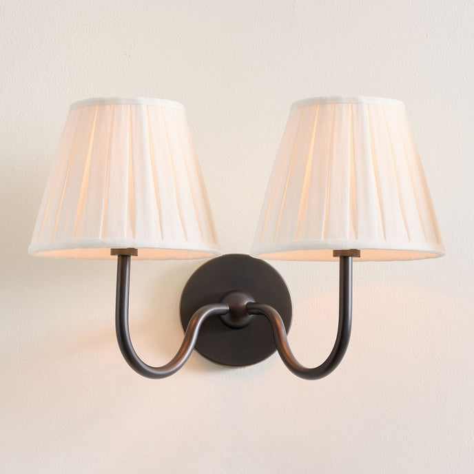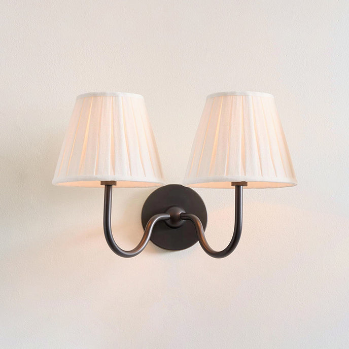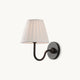 The Winkle Wall Light from Mooijane combines vintage charm with exquisite craftsmanship. With its elegant curved brass arms and pleated fabric shade, it emits a warm, inviting glow. The blackened copper metal base adds contrast and stability, while the cascading shade design softens the light, adding comfort and ambience to any room.