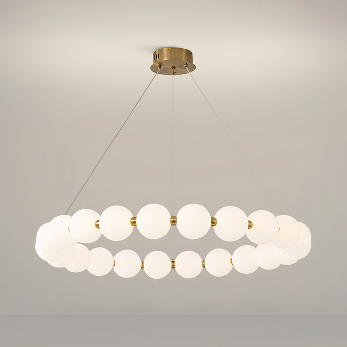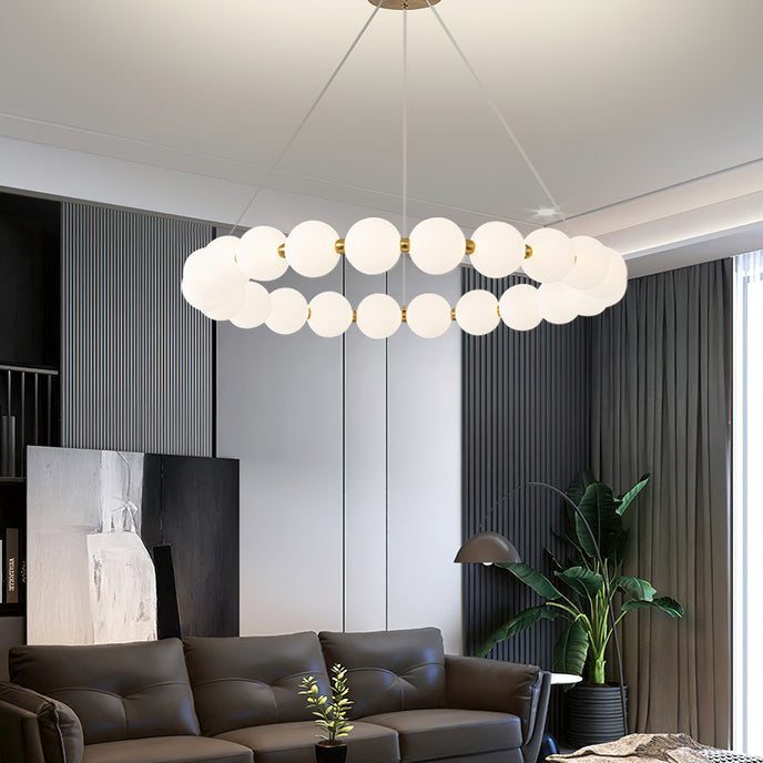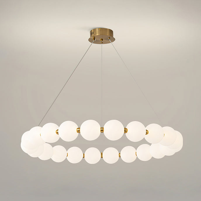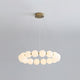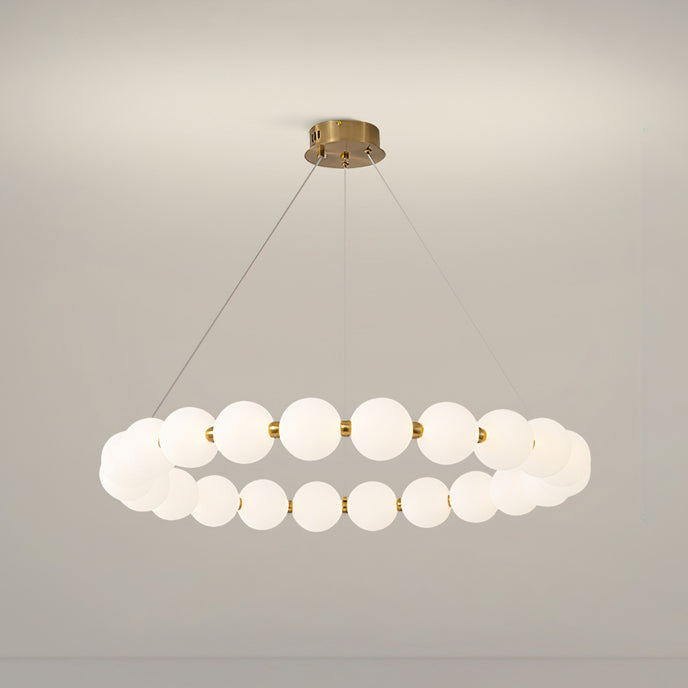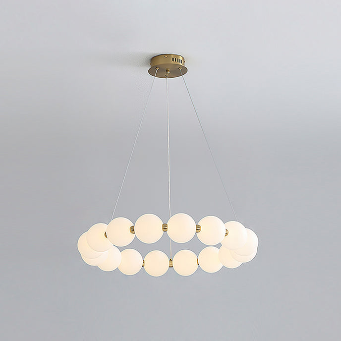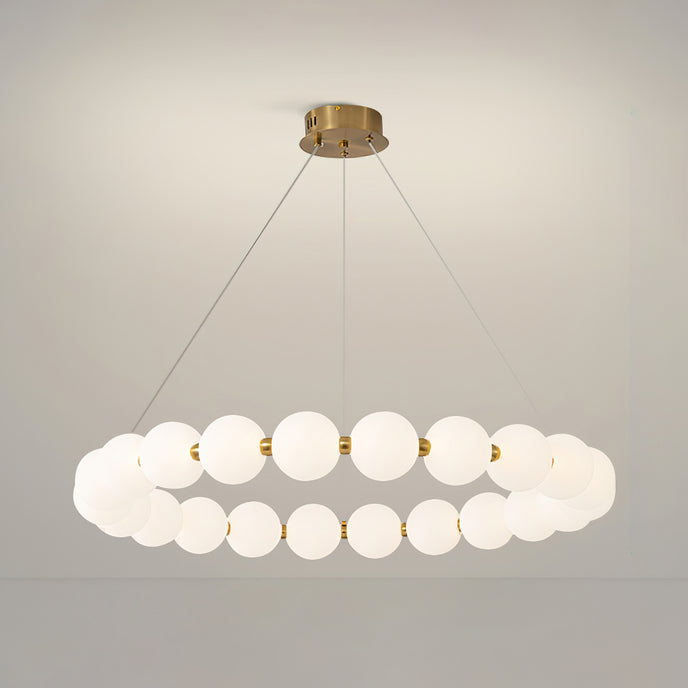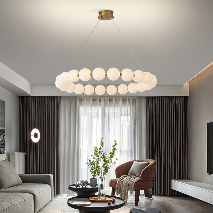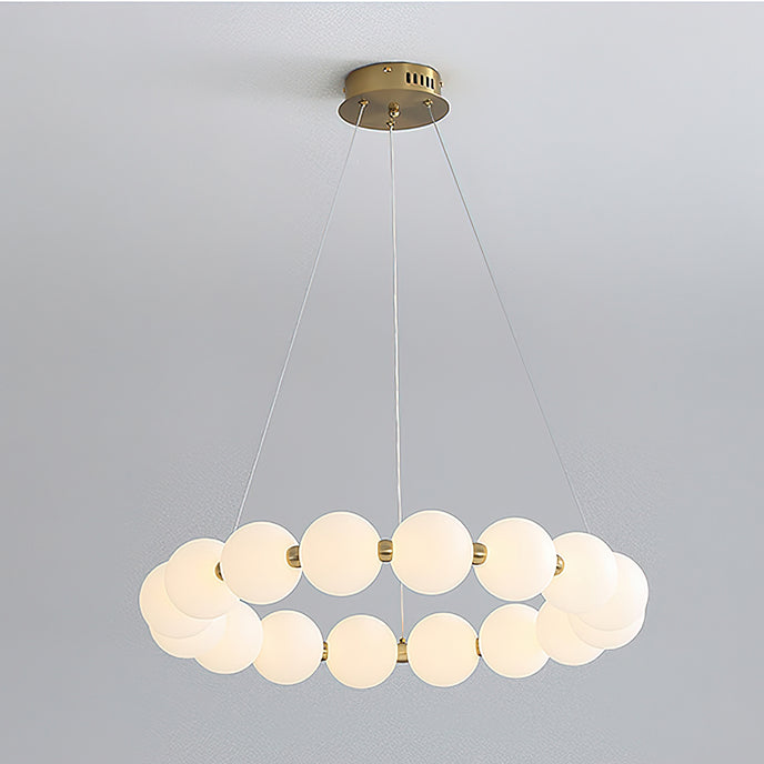Create a sophisticated ambiance with the Agnes Chandelier from Mooijane. Its elegant copper frame with a shiny gold finish and a pearl-reminiscent globe-shaped lampshade will elevate the beauty of any setting. Perfect for a living room or dining room, its captivating light will serve as a charming focal point, adding a touch of glamour to your space.