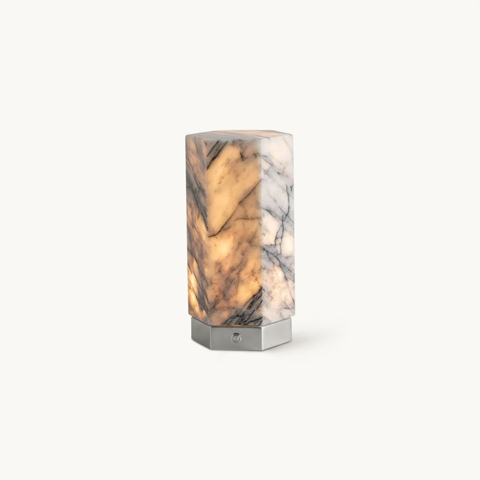 The Amania Table Lamp by Mooijane pairs solid marble with a sleek stainless steel base for a look that feels modern, refined, and timeless. Its clean rectangular form highlights the natural veining of the stone, while the softly illuminated marble creates a warm, ambient glow. Perfect for bedside tables, consoles, and living spaces.