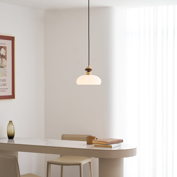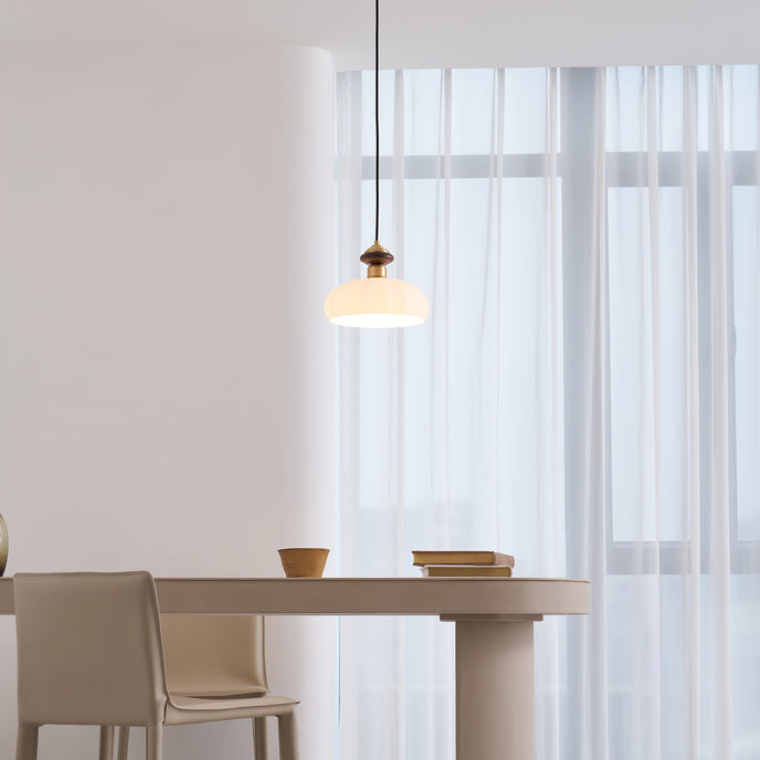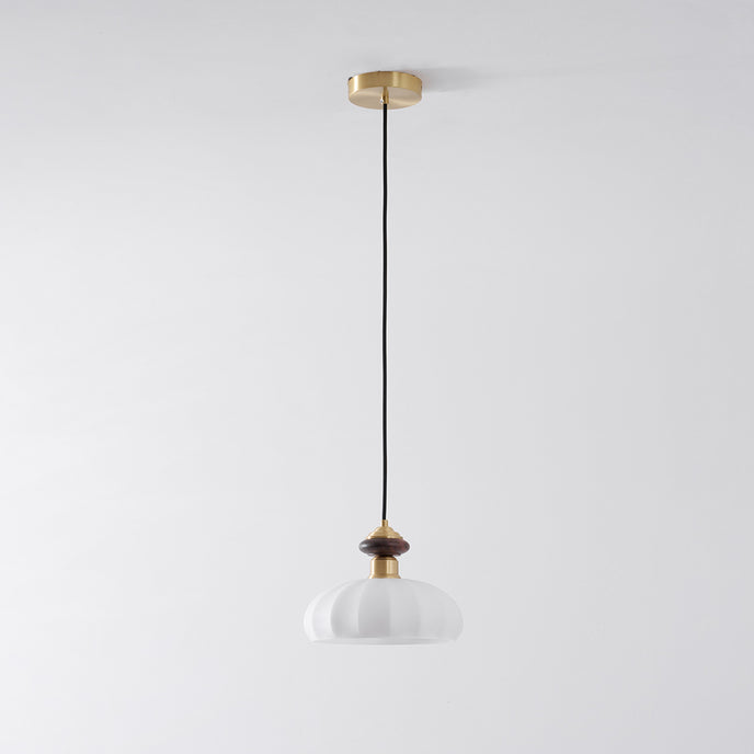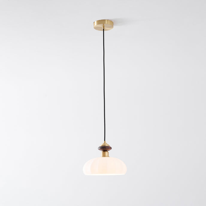 Update your dining room with the Bailey Glass Pendant Light from Mooijane. Crafted from walnut wood with brass accents and a glass shade, this vintage lamp adds retro charm to any occasion.