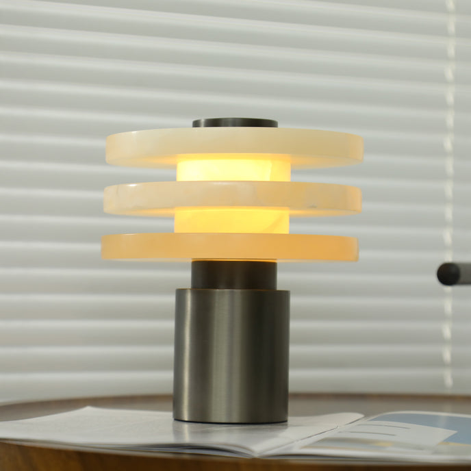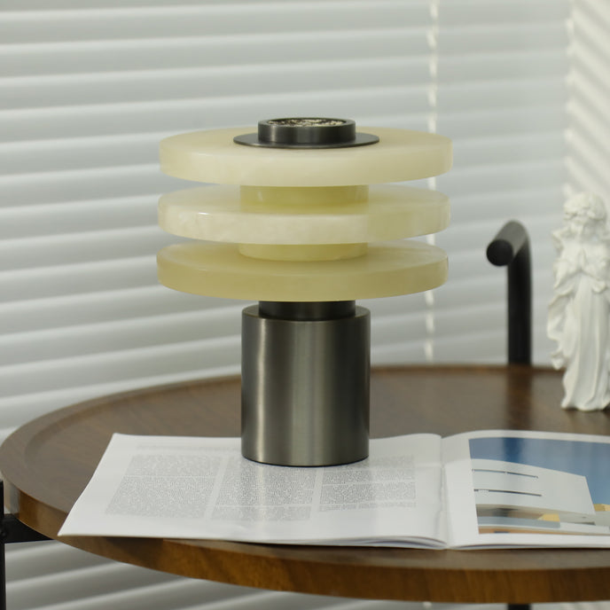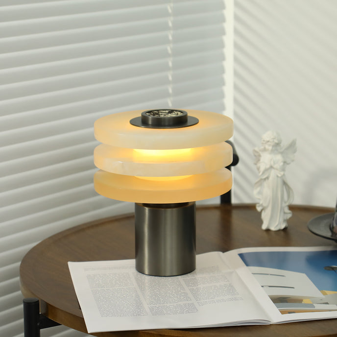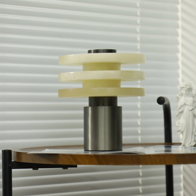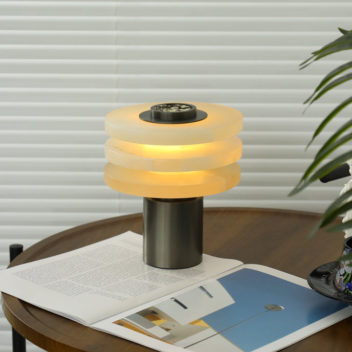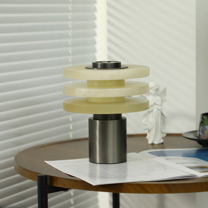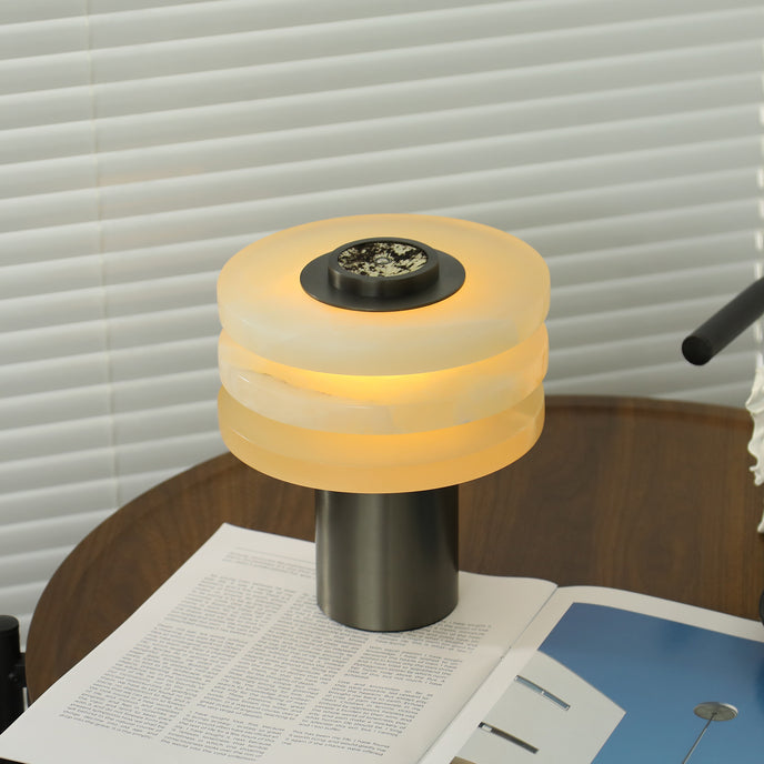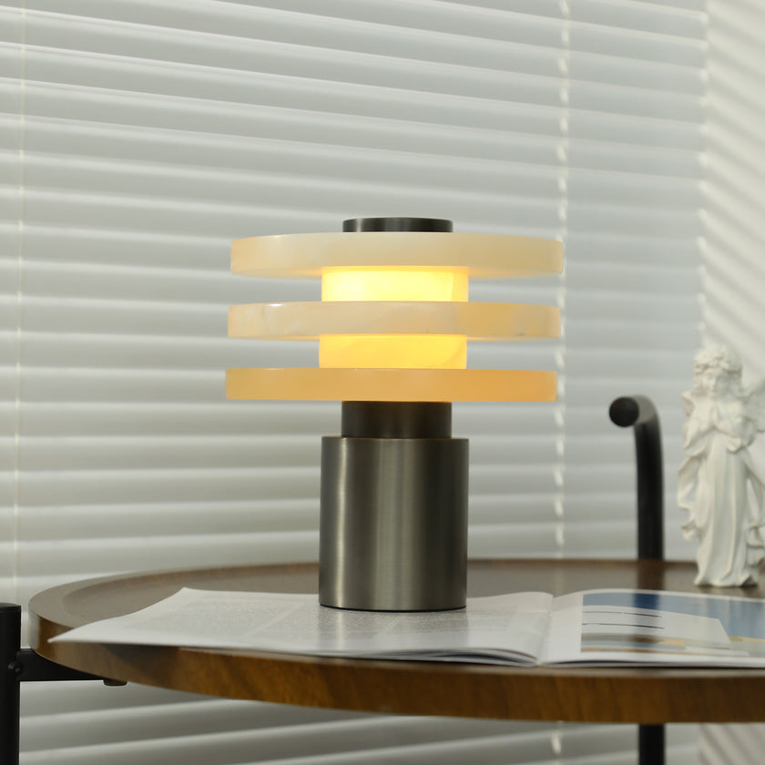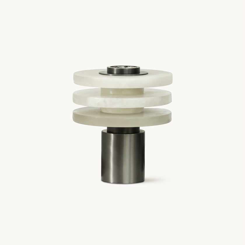 The Benoit table lamp by Mooijane seamlessly blends metal with alabaster, showcasing a harmonious balance between modern design and natural beauty. Its multi-layered, translucent alabaster shade softly diffuses light, creating a warm and elegant atmosphere. The sturdy, brushed stainless steel base adds a touch of sophistication, while its unique design lends a modern, stylish flair.
