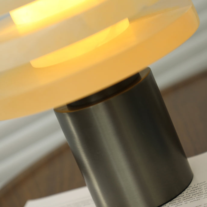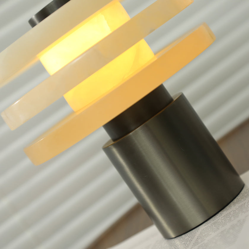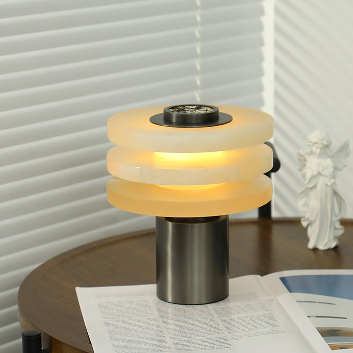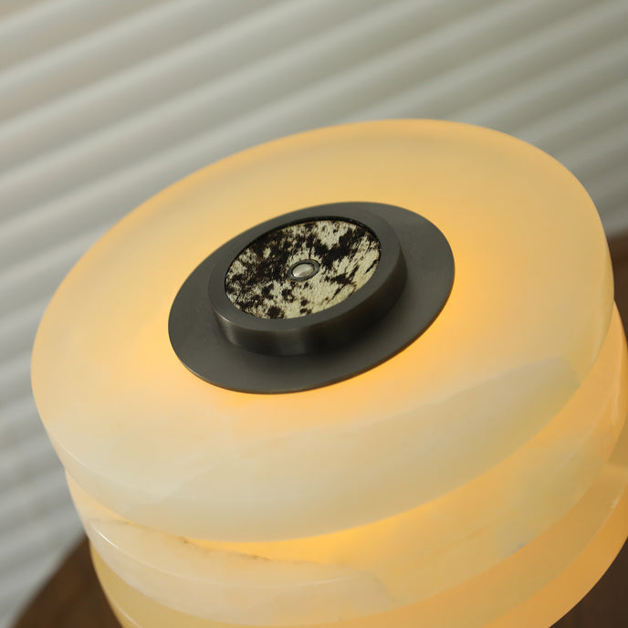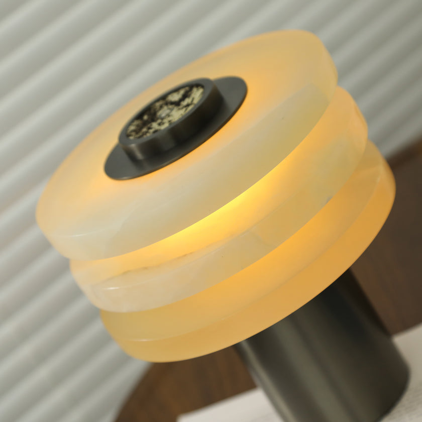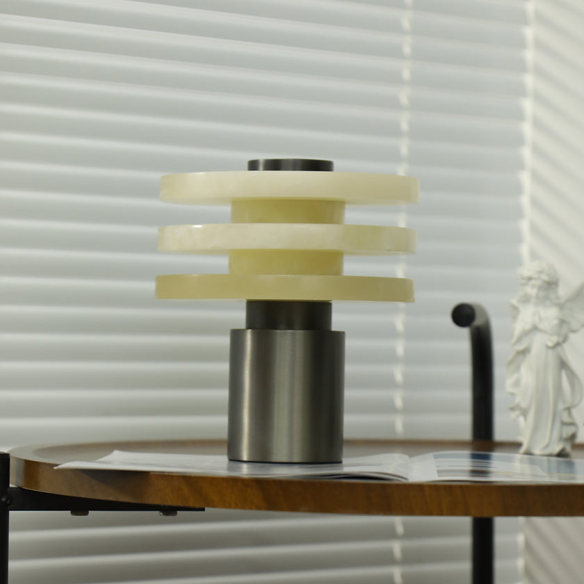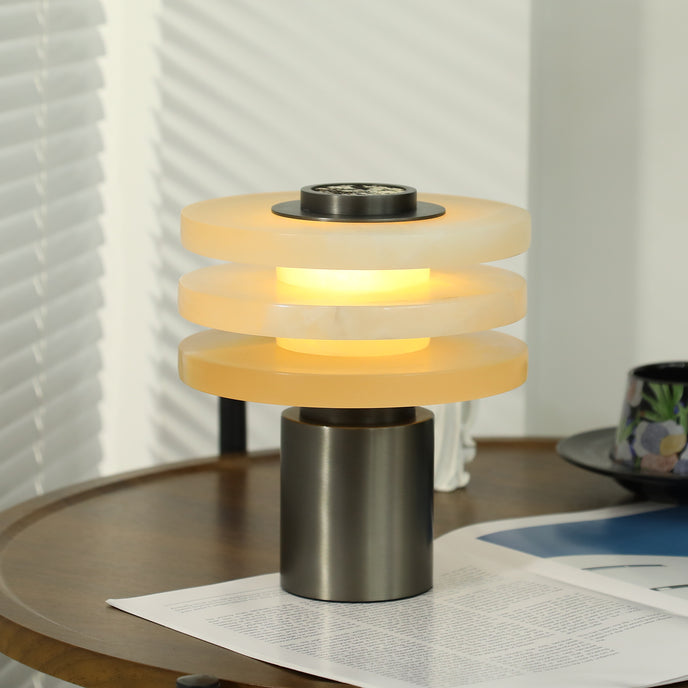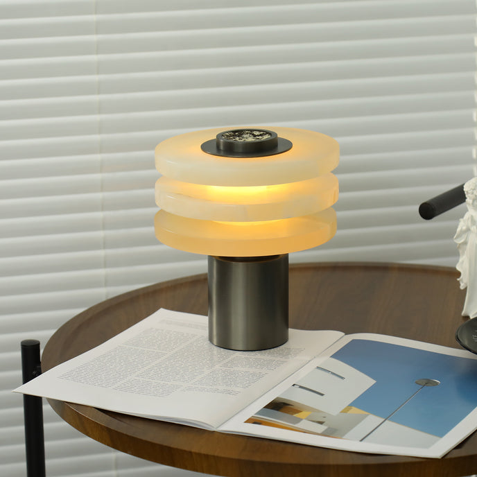 The Benoit table lamp by Mooijane seamlessly blends metal with alabaster, showcasing a harmonious balance between modern design and natural beauty. Its multi-layered, translucent alabaster shade softly diffuses light, creating a warm and elegant atmosphere. The sturdy, brushed stainless steel base adds a touch of sophistication, while its unique design lends a modern, stylish flair.