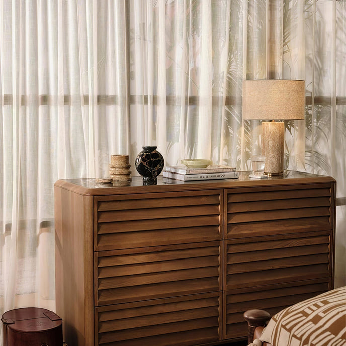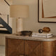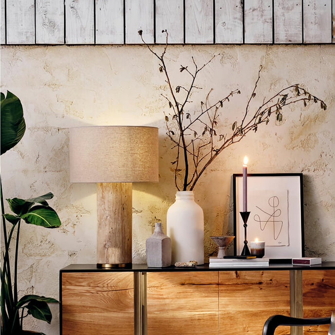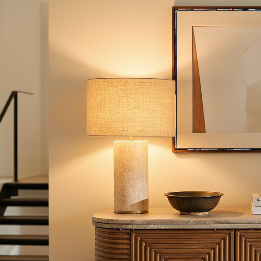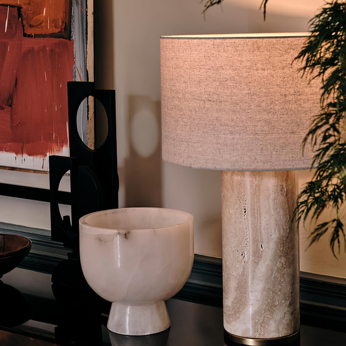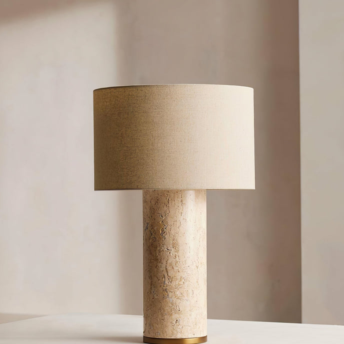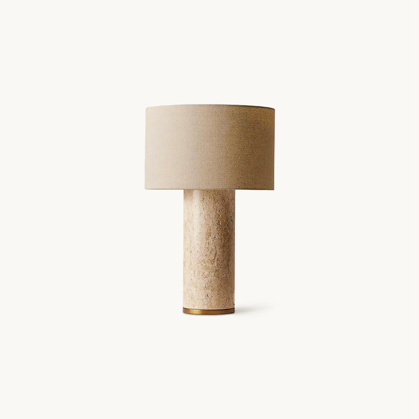 The Botorrita Table Lamp from Mooijane is crafted from yellow travertine, showcasing unique color variations and natural inclusions. Paired with refined metal accents and a natural linen shade, this lamp offers both elegance and individuality, making it a standout piece in any room.