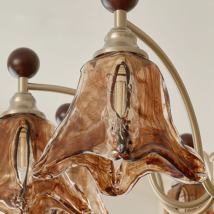 The Bravino Chandelier by Mooijane captures organic beauty through its soft, flowing lines and balanced mix of metal, glass, and wood. The matte-finished metal frame exudes modern refinement, while hand-blown amber glass shades bloom like delicate flowers, casting a warm, inviting glow. A central wooden accent adds natural depth, enhancing the design’s graceful harmony.