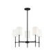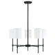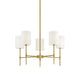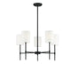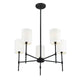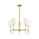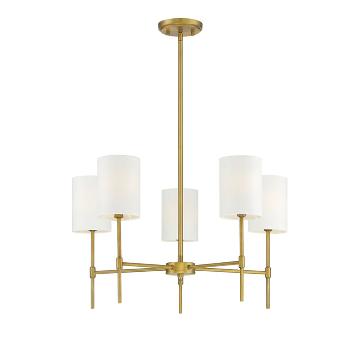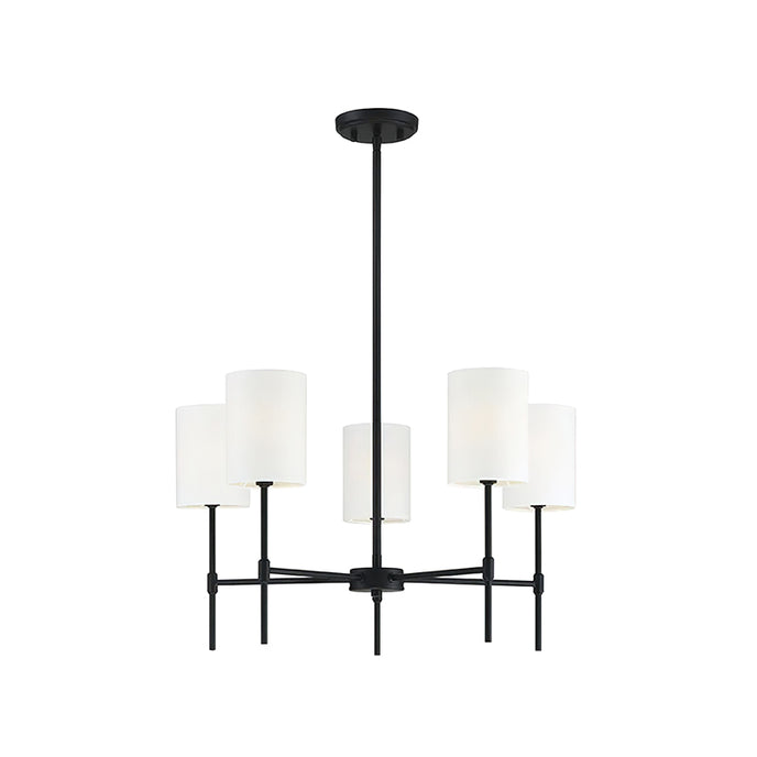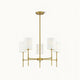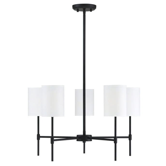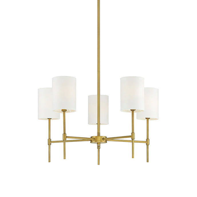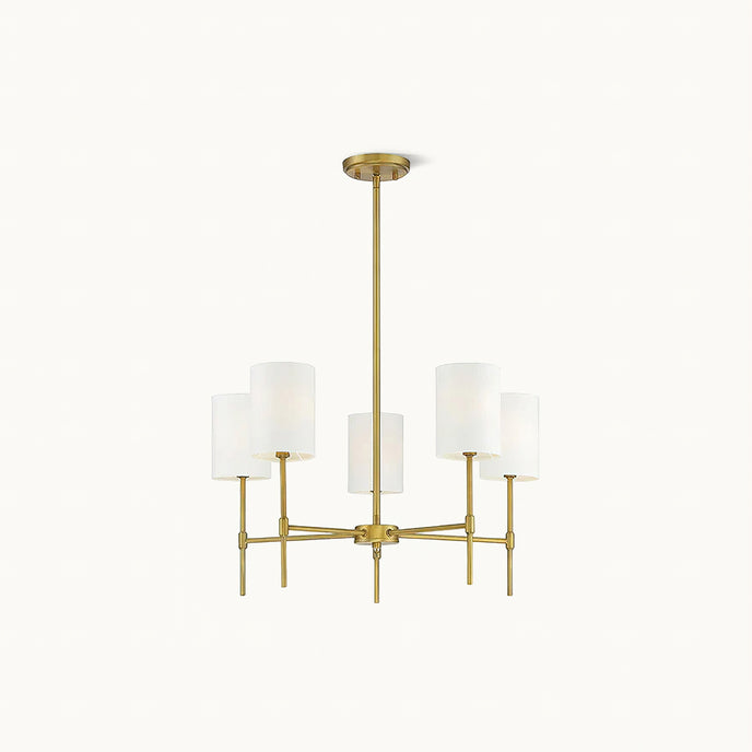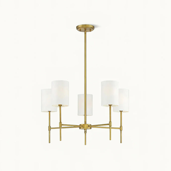 Transform your living space with the Camila Chandelier. Featuring a sleek frame finished in matte black or natural brass, this 5-light chandelier adds modern appeal to your home. Its linear structure and white fabric drum shade create a contemporary feel perfect for any living or dining room.