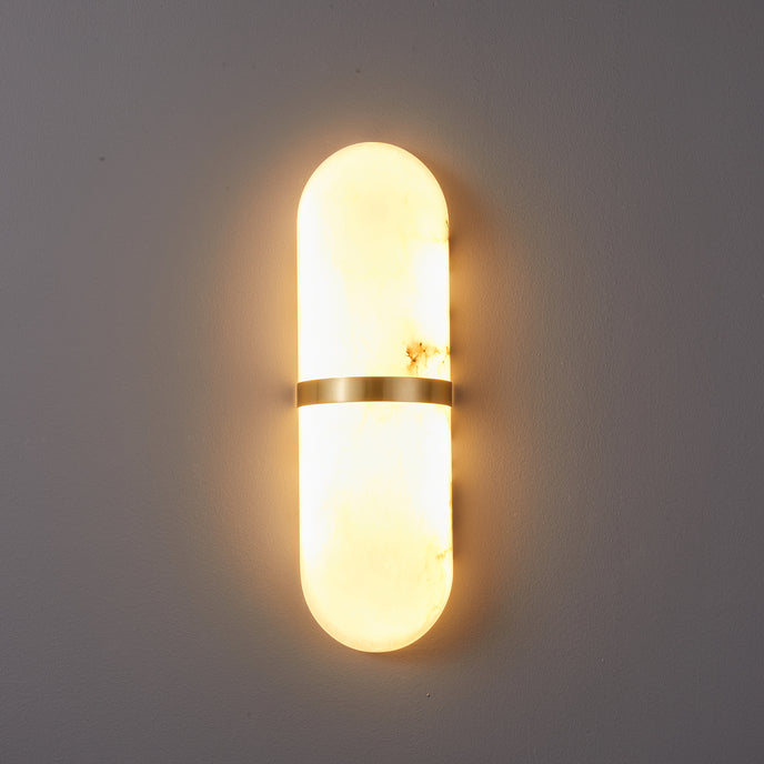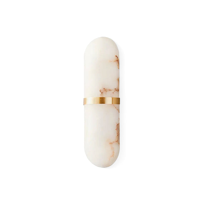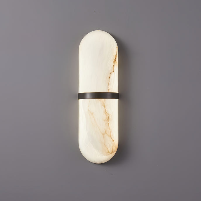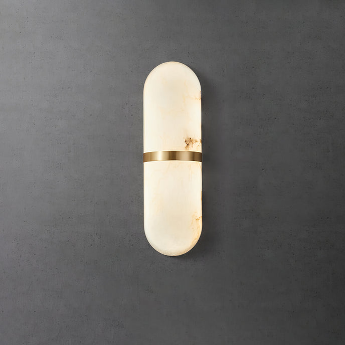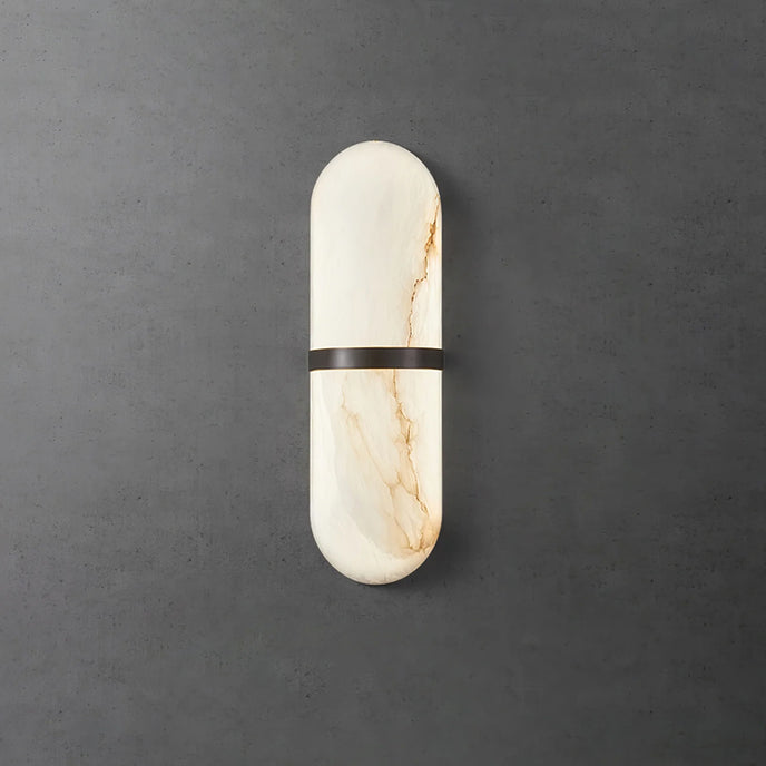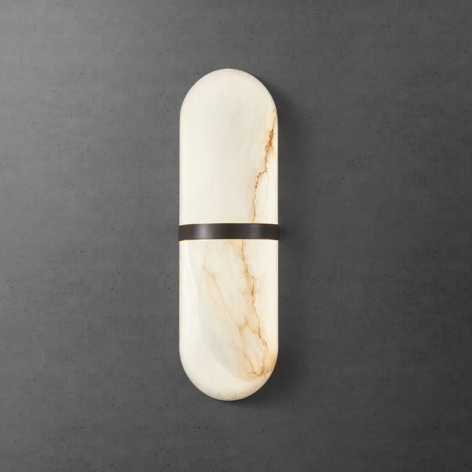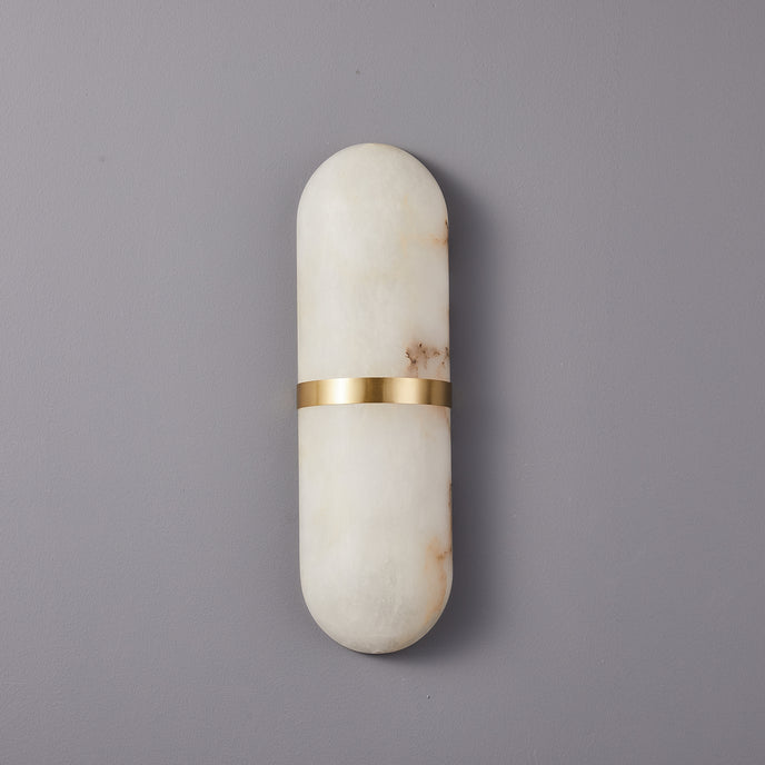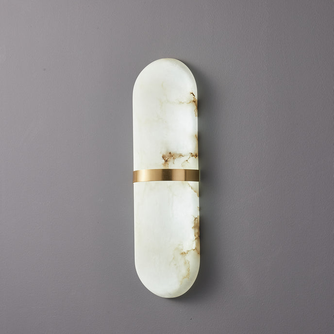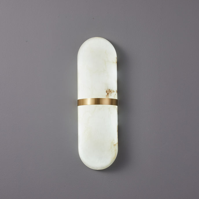 Modern und elegant, unsere Melange Pill Form Sconce verfügt über einen reinen Alabaster-Farbton. Ein massives Band, das in zwei eleganten Metallausführungen angeboten wird, bringt den Alabasterschirm zur Geltung und verleiht dem Design ein gehobenes Gefühl.