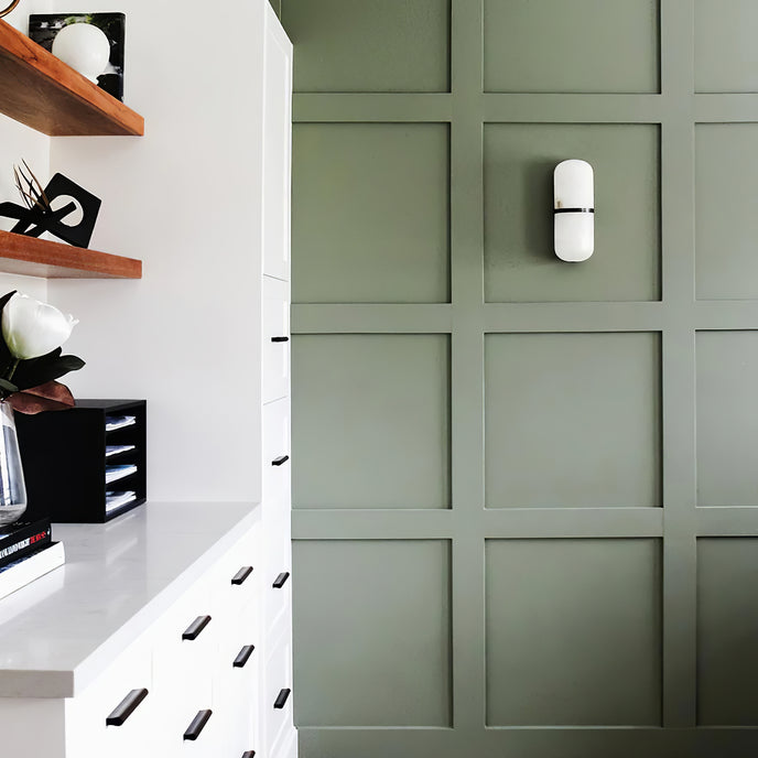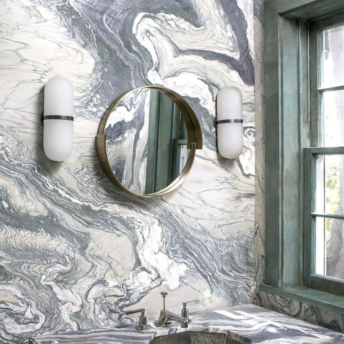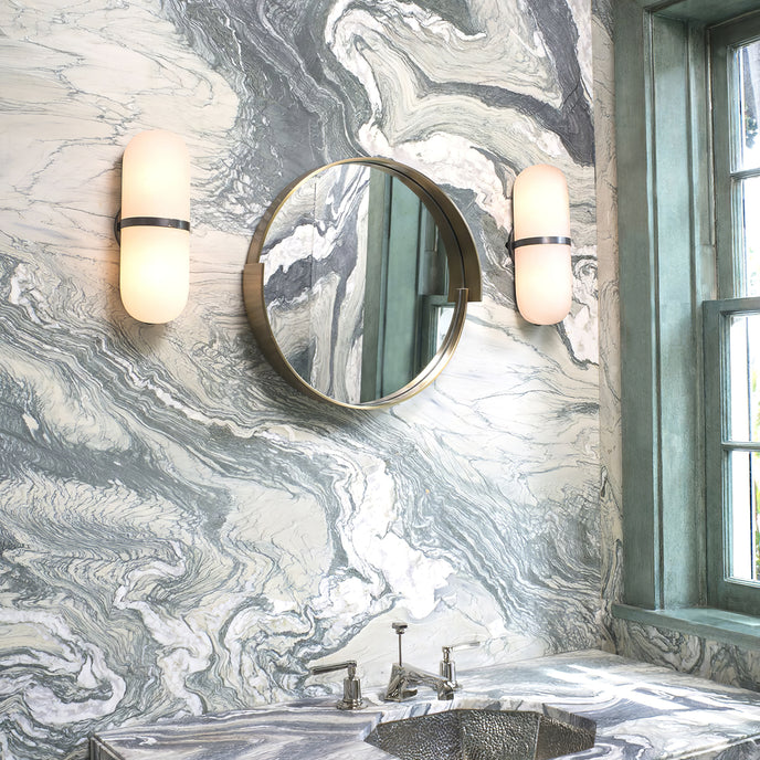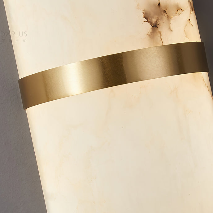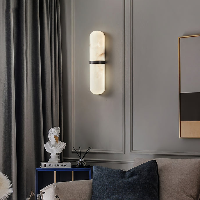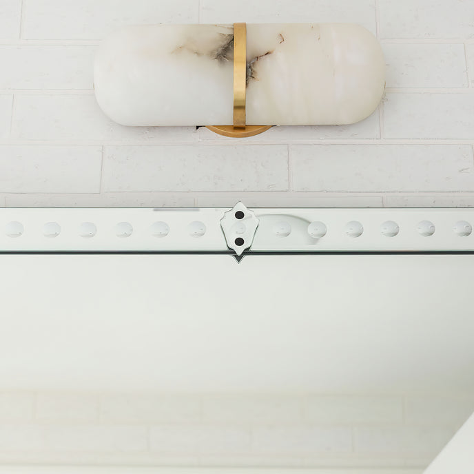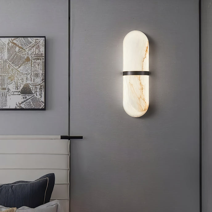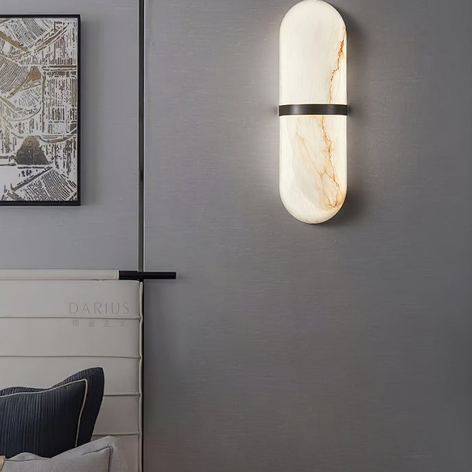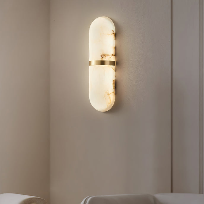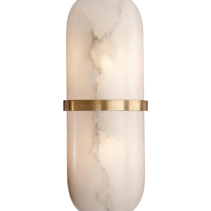 Modern und elegant, unsere Melange Pill Form Sconce verfügt über einen reinen Alabaster-Farbton. Ein massives Band, das in zwei eleganten Metallausführungen angeboten wird, bringt den Alabasterschirm zur Geltung und verleiht dem Design ein gehobenes Gefühl.