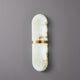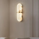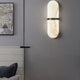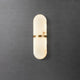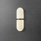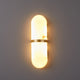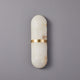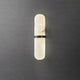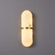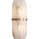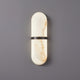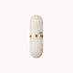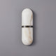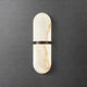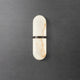 Mühelos Paarung von natürlichem Alabaster und eleganten Metalldetails in einer stromlinienförmigen geometrischen Form, die Melange Pill Form Sconce strahlt eine moderne Raffinesse aus und betont gleichzeitig die Schönheit des Natursteins. Diese Wandleuchte besteht aus handgeschnitztem natürlichem Alabaster mit Details in Antikmessing oder in Schwarz.