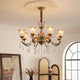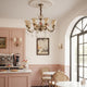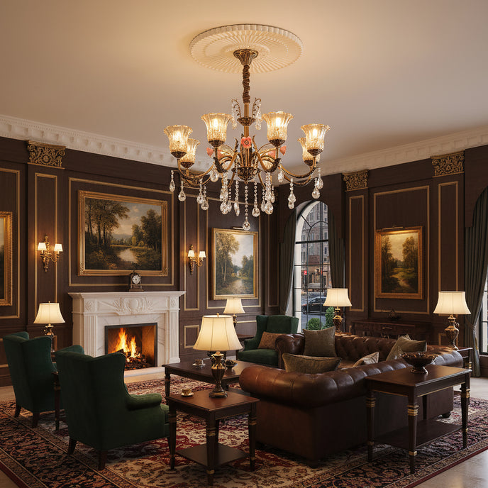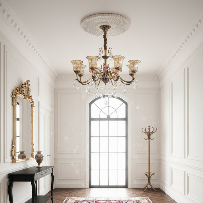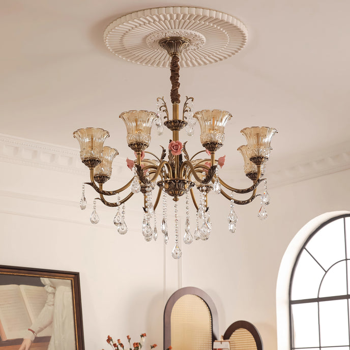 The Caroline Chandelier by Mooijane embodies the elegance of French classic design with a touch of romantic charm. Crafted from fine brass in an antique bronze finish, its slender, curved arms support petal-shaped glass shades that emit a soft amber glow. Crystal pendants shimmer like morning dew, while delicate pink floral accents add a poetic flourish. Ideal for dining rooms, bedrooms, or living spaces, this chandelier brings luxurious warmth and timeless sophistication to any interior.