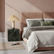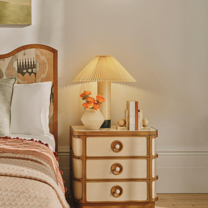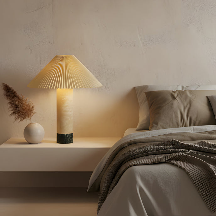 The Daniella Table Lamp from Mooijane highlights a thoughtful fusion of natural materials and refined craftsmanship. Its solid cylindrical base pairs warm travertine with richly veined green marble, creating a striking yet balanced visual contrast. The handmade paper shade features a classic conical silhouette that gently diffuses light, giving the lamp a soft, calming glow.