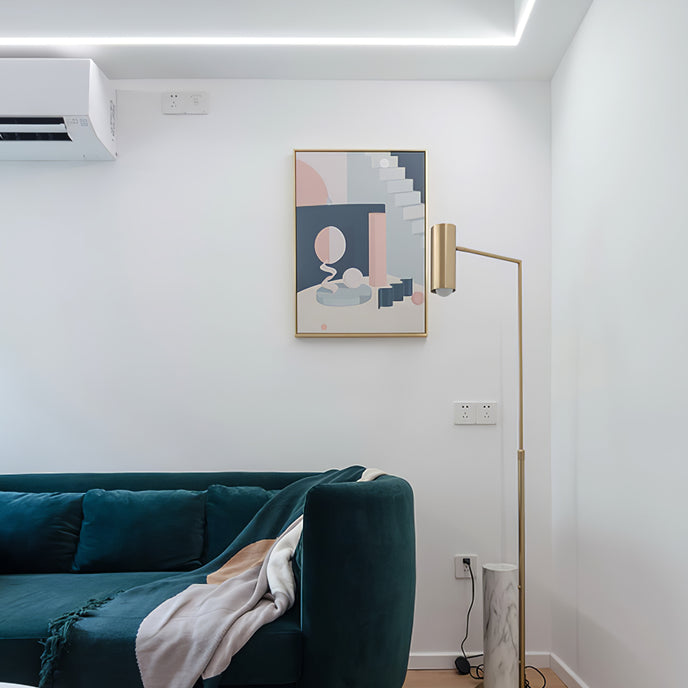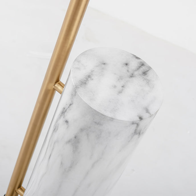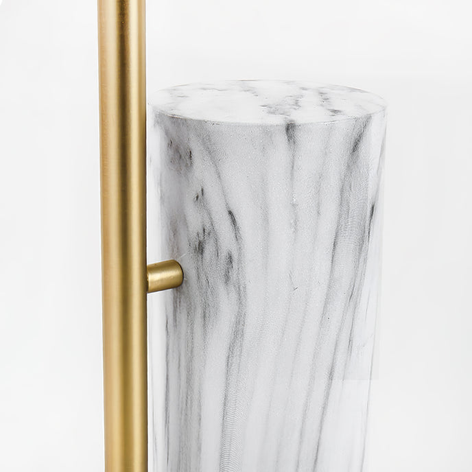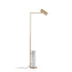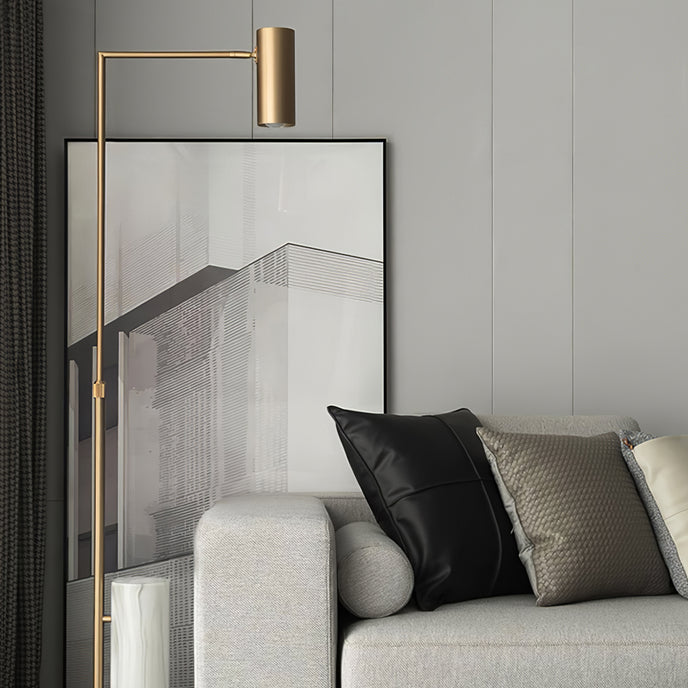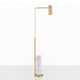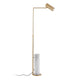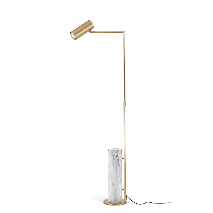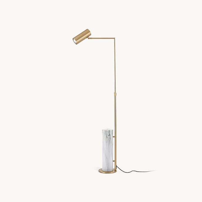 Sleek, Mid-Century modern design inspires the Dien floor lamp. A streamlined metal frame in an iron finish, holds the single bulb outwards on an arm, allowing the function of this piece to take precedence. Featuring a white marble base for stability, the Dien focuses light through a metal, cylindrical shade. This floor lamp brings ambient lighting to corners or convenient reading light to seating areas. The light can be operated with a convenient foot switch.