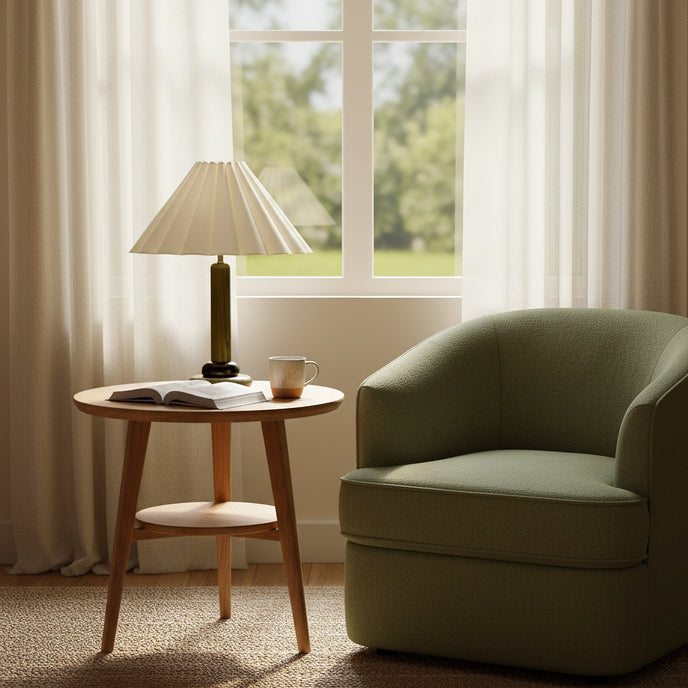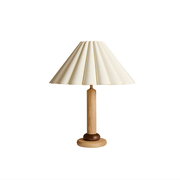 The Ferguson Table Lamp from Mooijane blends retro simplicity with natural elegance. Crafted from warm solid wood, its upright cylindrical stem and sturdy round base offer clean, balanced lines. The pleated white fabric shade adds texture and softness, gently diffusing light to create a calm, inviting atmosphere. Ideal for bedside tables, desks, or reading corners, this lamp combines function and charm to enrich any living space.