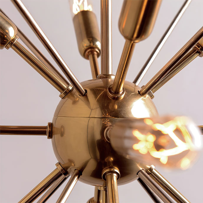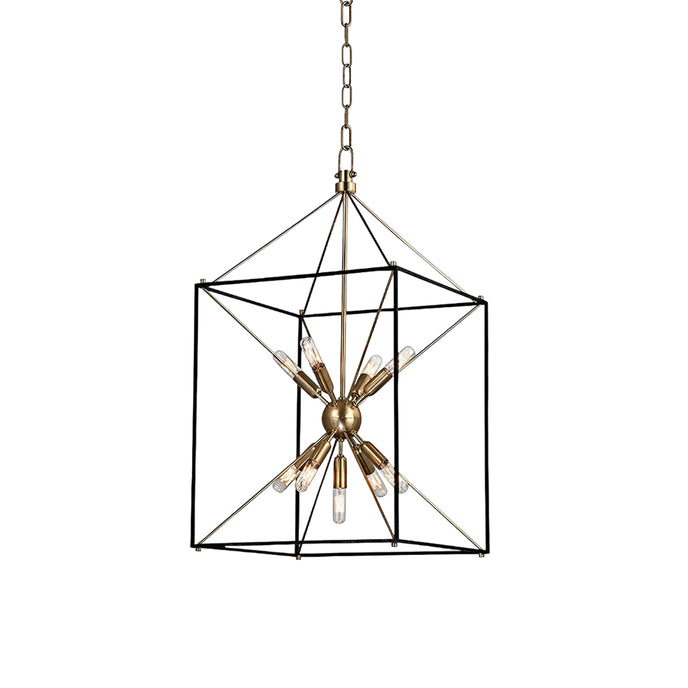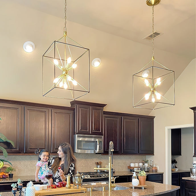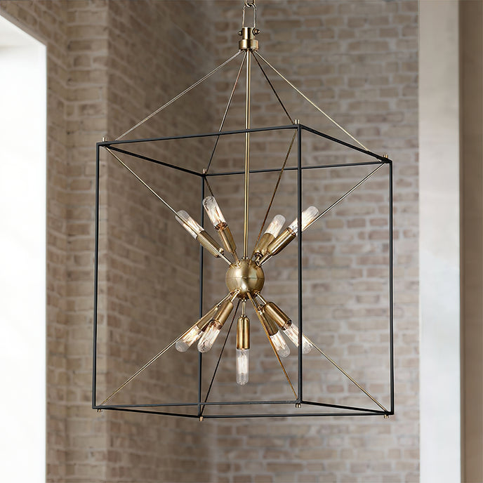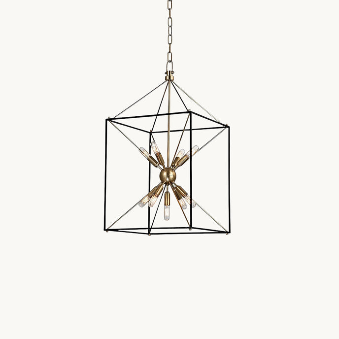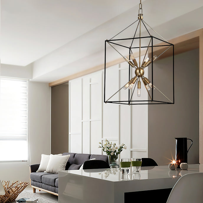 Introduce Mooijane's Glendale Pendant Light into your home for a fusion of traditional and modern design. The classic lantern shape, coupled with the "Sputnik-style" lamp filled with vintage bulbs, offers warm vintage charm with a hint of modern flair. The black metal cube and pyramid structure add texture and sophistication to any room.