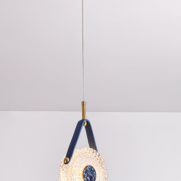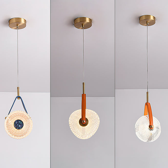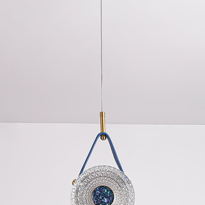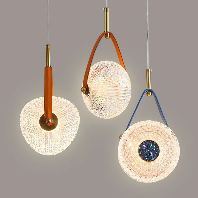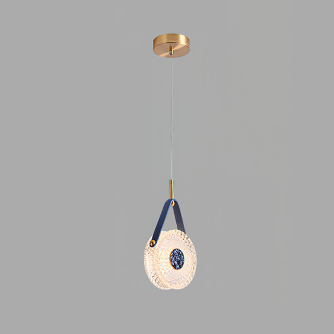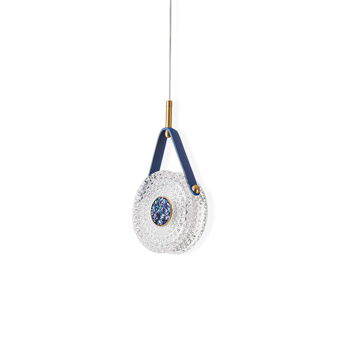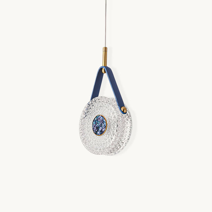 Die Gong Pendelleuchte ist ein zeitloses Designstück. Sie ist mit einem Messingrahmen und Lederakzenten gefertigt und verfügt über einen transparenten Blasen-Acryl-Lampenschirm, der sanft warmes, romantisches Licht streut. Inspiriert von der zeitlosen Eleganz eines Gongs verleiht diese Pendelleuchte jedem Raum einen Hauch von raffiniertem Stil.