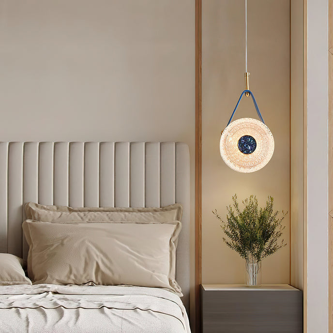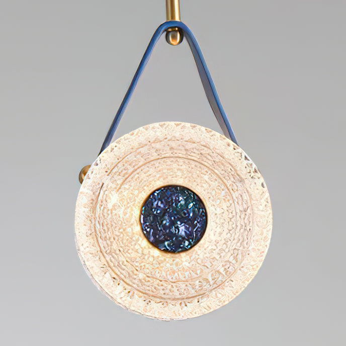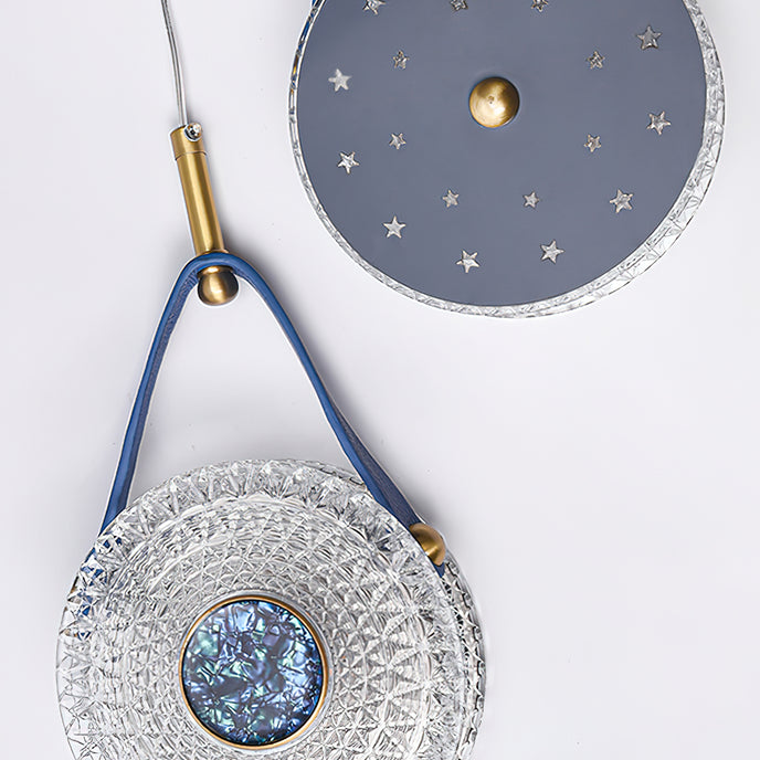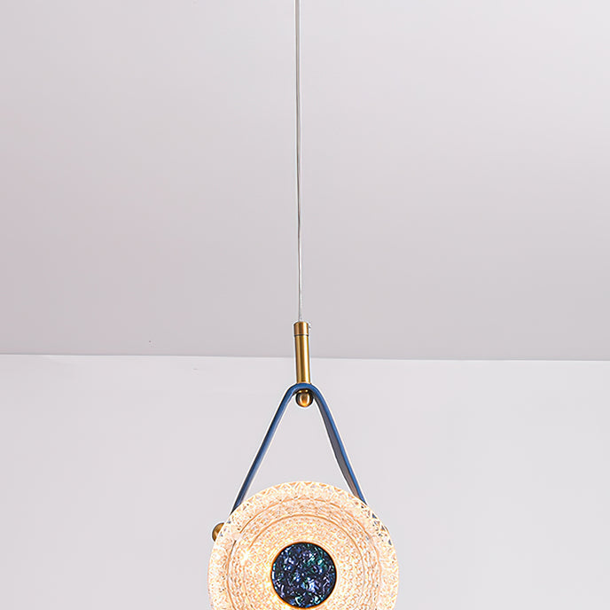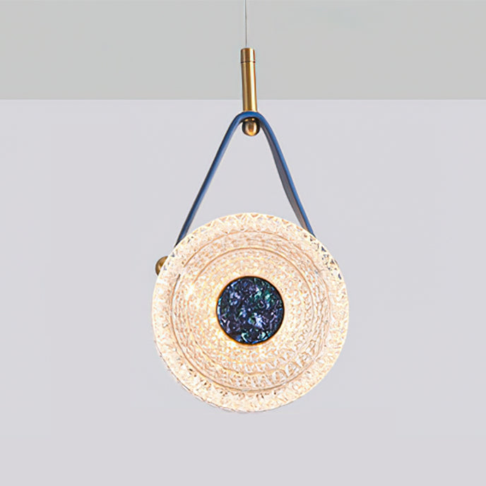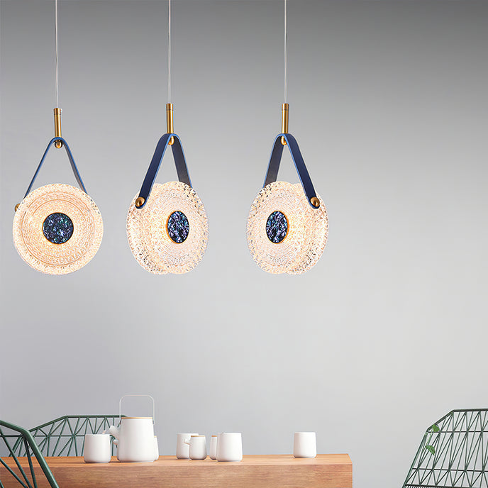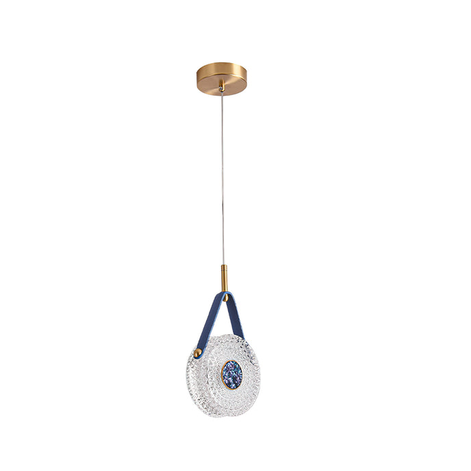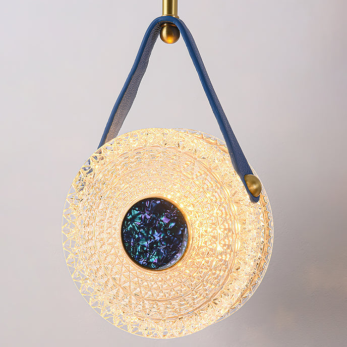 Die Gong Pendelleuchte ist ein zeitloses Designstück. Sie ist mit einem Messingrahmen und Lederakzenten gefertigt und verfügt über einen transparenten Blasen-Acryl-Lampenschirm, der sanft warmes, romantisches Licht streut. Inspiriert von der zeitlosen Eleganz eines Gongs verleiht diese Pendelleuchte jedem Raum einen Hauch von raffiniertem Stil.