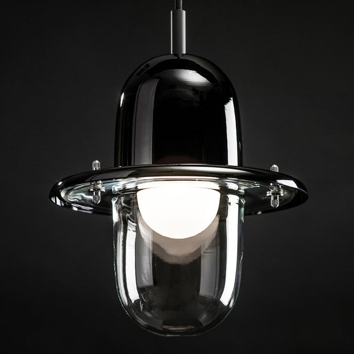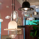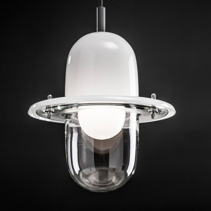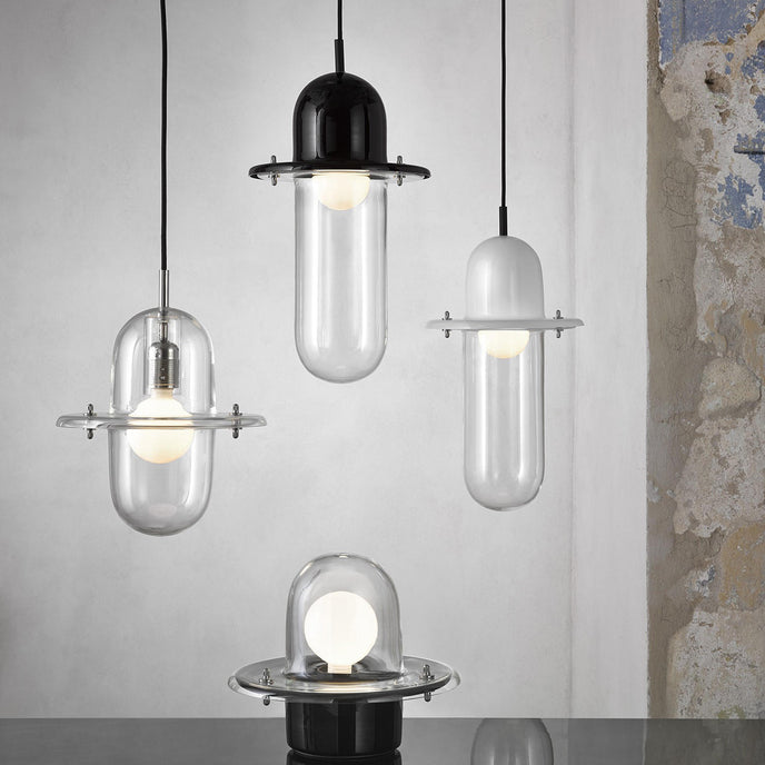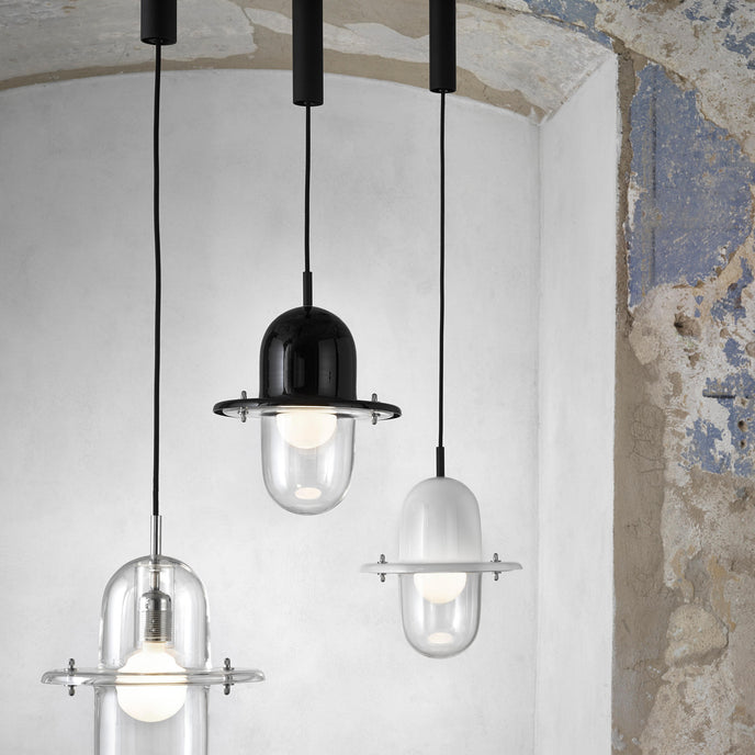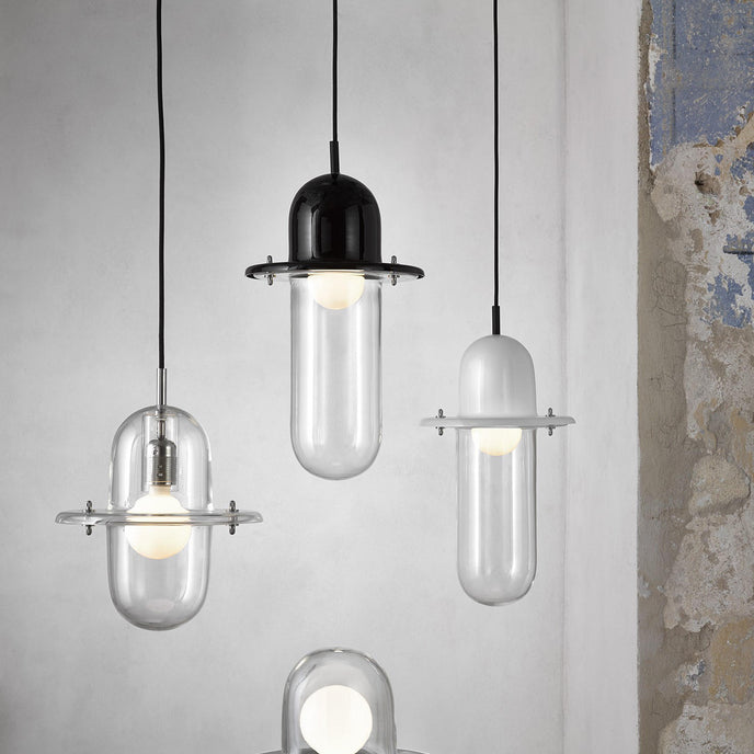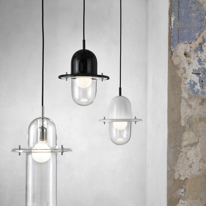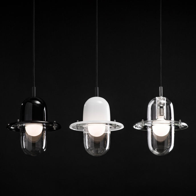 Inspiriert von Industriebeleuchtung und Straßenlaternen, die in vielen europäischen Städten zu finden sind, kombiniert die Hat-Pendelleuchte Praktikabilität und Schlichtheit mit einem humorvollen Hinweis auf die traditionelle, viktorianische Melone. Sein transparenter oder farbiger Glasaufsatz beleuchtet die Decke, während der durchsichtige untere Teil stark zweckmäßig ist. Die oberen und unteren Komponenten von Hats sind durch drei spezielle Schrauben im Industriestil verbunden, und im Inneren dämpft eine durchscheinende Glühbirne das Licht und verteilt es gleichmäßig. Hats-Pendelleuchten sind ideal für kleine Innenräume und können auch zu Gruppen kombiniert werden.