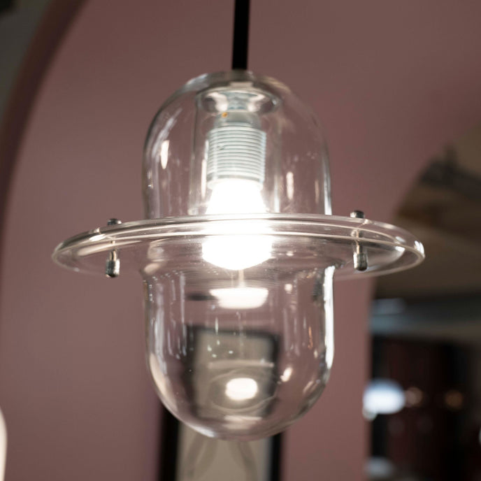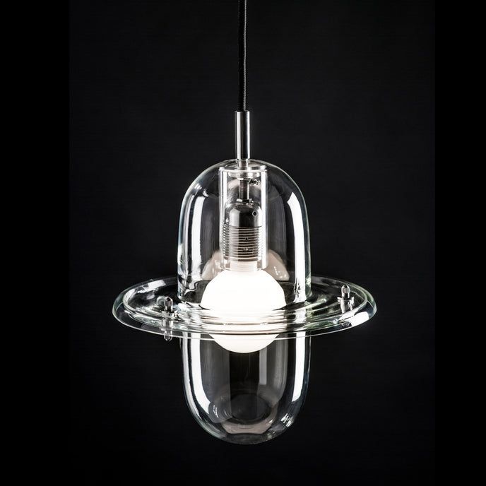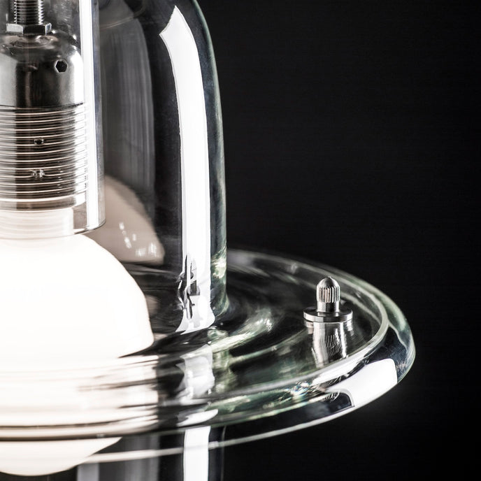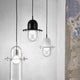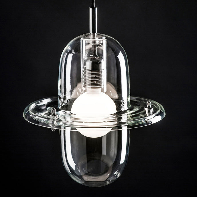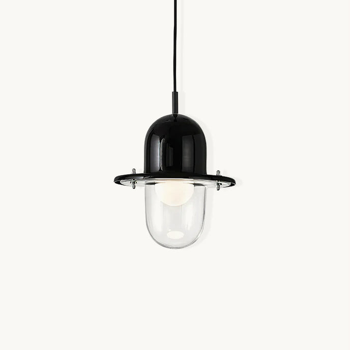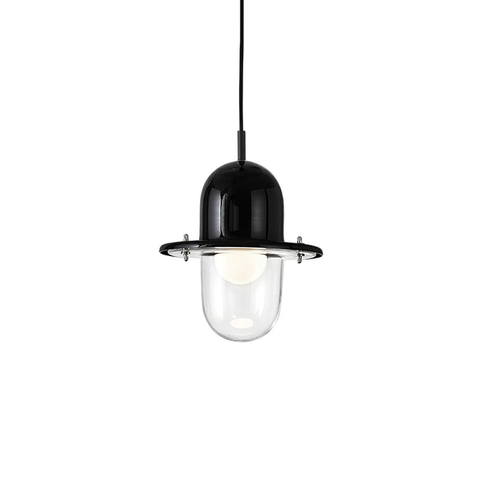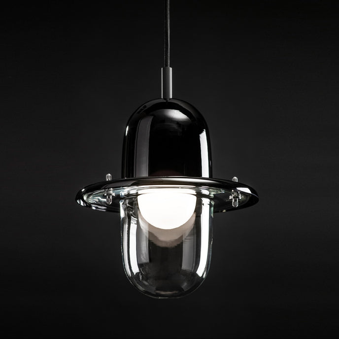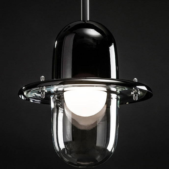 Inspiriert von Industriebeleuchtung und Straßenlaternen, die in vielen europäischen Städten zu finden sind, kombiniert die Hat-Pendelleuchte Praktikabilität und Schlichtheit mit einem humorvollen Hinweis auf die traditionelle, viktorianische Melone. Sein transparenter oder farbiger Glasaufsatz beleuchtet die Decke, während der durchsichtige untere Teil stark zweckmäßig ist. Die oberen und unteren Komponenten von Hats sind durch drei spezielle Schrauben im Industriestil verbunden, und im Inneren dämpft eine durchscheinende Glühbirne das Licht und verteilt es gleichmäßig. Hats-Pendelleuchten sind ideal für kleine Innenräume und können auch zu Gruppen kombiniert werden.